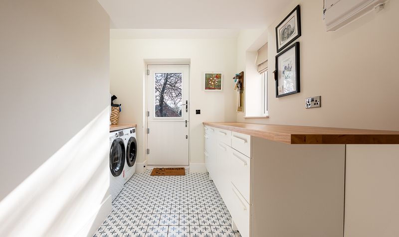 The ground floor is further enhanced by a well-appointed utility room, providing valuable additional workspace and storage away from the main kitchen. Fitted with matching cabinetry and solid wood work surfaces, it offers ample storage along with space and plumbing for laundry appliances. Stylish patterned flooring adds character, while a rear access door provides convenient entry to the garden.