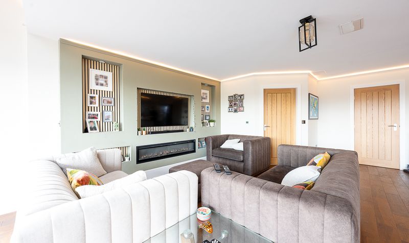 Flowing seamlessly from the kitchen, the seating area offers a cosy yet contemporary retreat within the open-plan layout. Centred around a bespoke media wall with inset electric fireplace and wall-mounted television, the space is enriched by subtle panelling, recessed shelving and ambient LED lighting. With ample room for multiple sofas, it provides the perfect setting for relaxed evenings or social occasions.