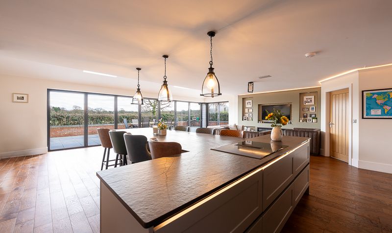 To the rear, a generous dining and lounge area overlooks the garden, ideal for both everyday living and entertaining on a larger scale. Expansive glazing and bi-folding doors span the rear elevation, opening fully onto the patio to create a seamless indoor-outdoor experience with uninterrupted countryside views. A roof lantern floods the space with natural light, while warm wood flooring runs throughout, enhancing the cohesion and quality of this exceptional family living area.
