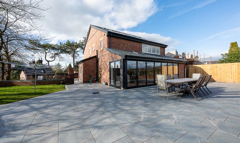 Externally, the rear garden has been designed for low maintenance and maximum enjoyment. A vast porcelain patio stretches across the rear of the home, providing multiple seating and dining areas, all perfectly positioned to take in the open rural aspect beyond the boundary wall. The bi-folding doors allow the kitchen and terrace to function as one expansive entertaining space during the warmer months, making this home particularly well suited to hosting. In addition to the patio, a generous lawned area to the side offers further outdoor space, ideal for children, pets or simply enjoying the peaceful surroundings.