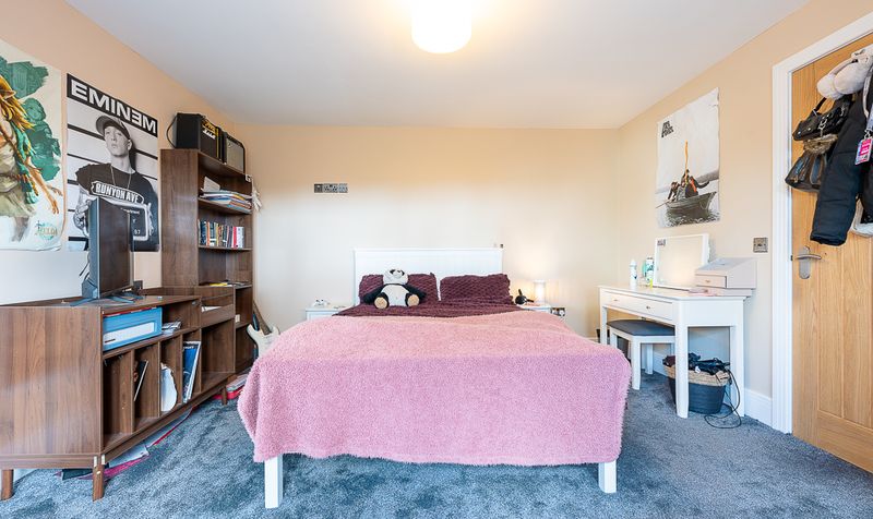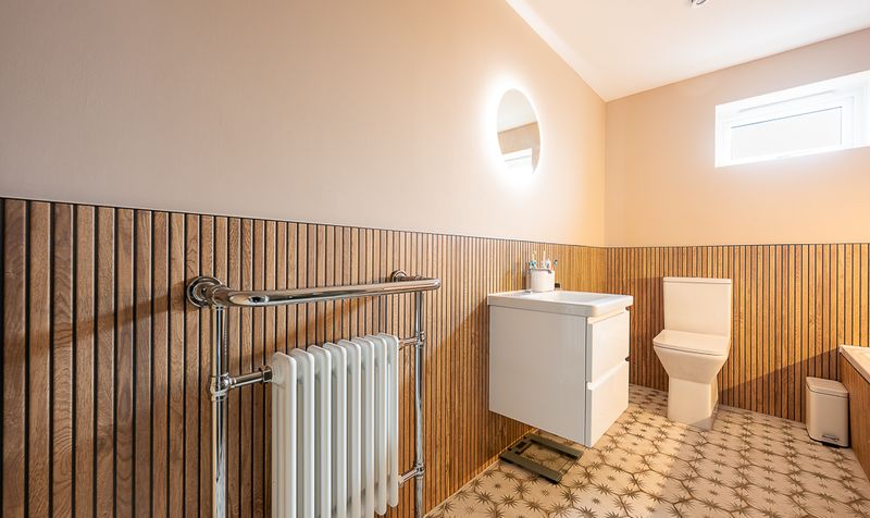 Three further well-proportioned double bedrooms are served by a stylish and contemporary family bathroom, finished to a high standard throughout. The space features a panelled bath with wall-mounted taps and overhead shower, alongside a separate glazed shower enclosure, offering both practicality and convenience for busy family life. A sleek wall-mounted vanity unit with inset basin provides useful storage beneath, complemented by a modern WC and chrome heated towel rail. Striking wood-effect panelling to half height adds warmth and texture, beautifully balanced by neutral upper walls and patterned flooring. Subtle feature lighting enhances the ambience, creating a bathroom that feels both luxurious and inviting.