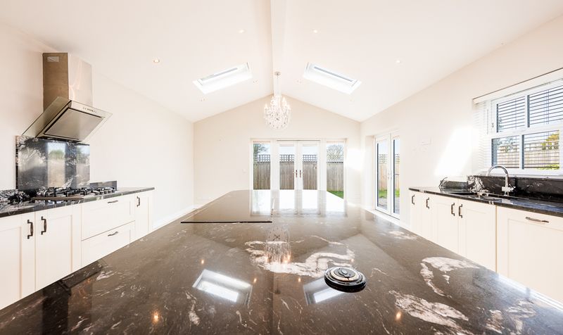 Moving through the home, the standout feature is the exceptional open-plan kitchen and dining area to the rear. Designed to be the true heart of the house, this impressive space benefits from a vaulted ceiling with skylights, elegant chandelier lighting and an abundance of glazing. French doors open directly onto the patio, creating a seamless connection between indoor and outdoor living. The kitchen is fitted with classic shaker-style cabinetry complemented by striking dark granite work surfaces and a substantial central island, offering both functionality and style. There is plenty of room for a large dining table, making it ideal for hosting family gatherings and social occasions.