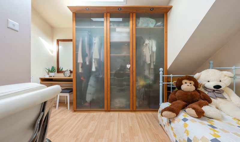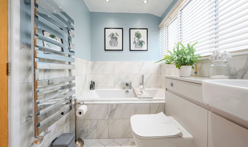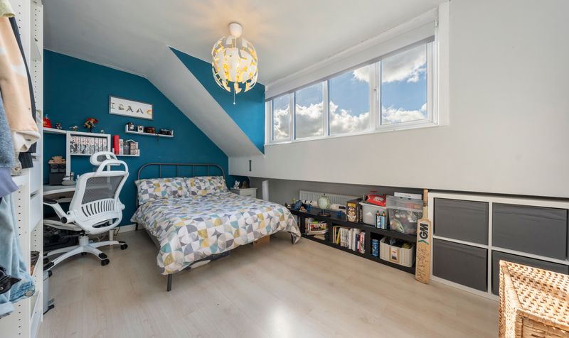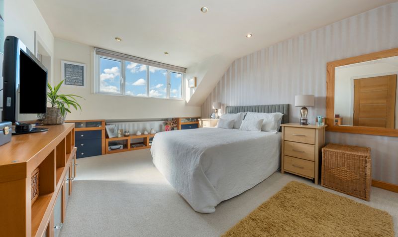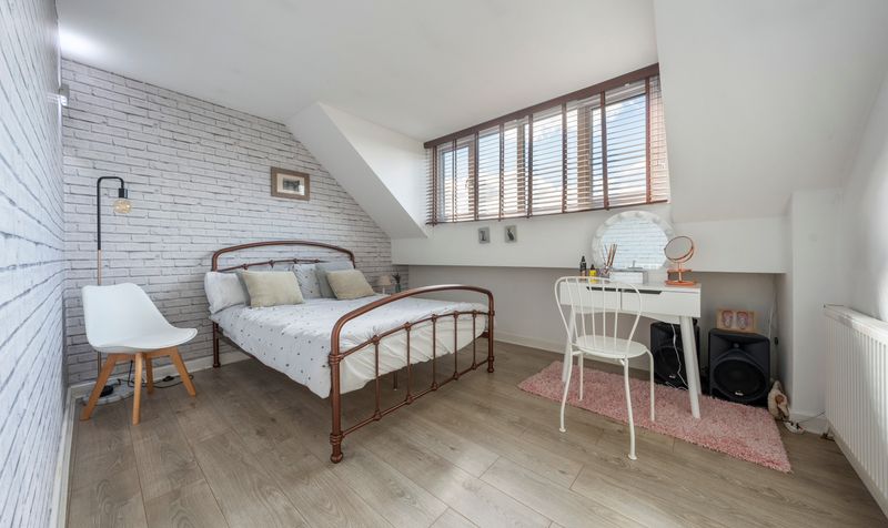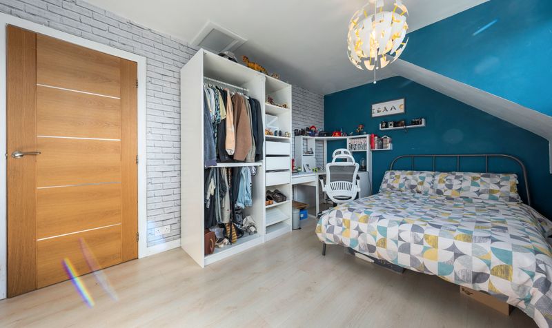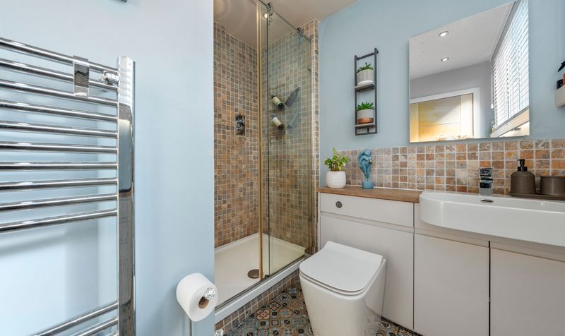 Heading upstairs, you will discover four spacious double bedrooms along with a bathroom. The master bedroom includes a selection of bespoke fitted wardrobes and features a three-piece en-suite shower room equipped with a vanity basin, low-level WC, and a glass screen walk-in shower. The family bathroom is modern and stylish, designed in classic white, and includes a low-level WC, vanity basin, walk-in shower, and a bath, complemented by matching tiling on the walls and floor. Each bedroom is generously sized and benefits from an abundance of natural light.