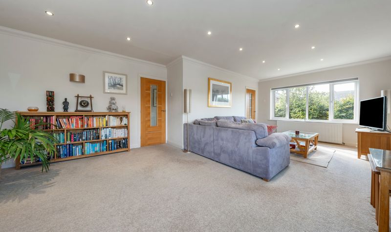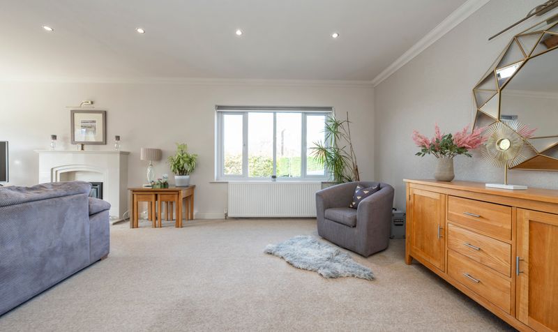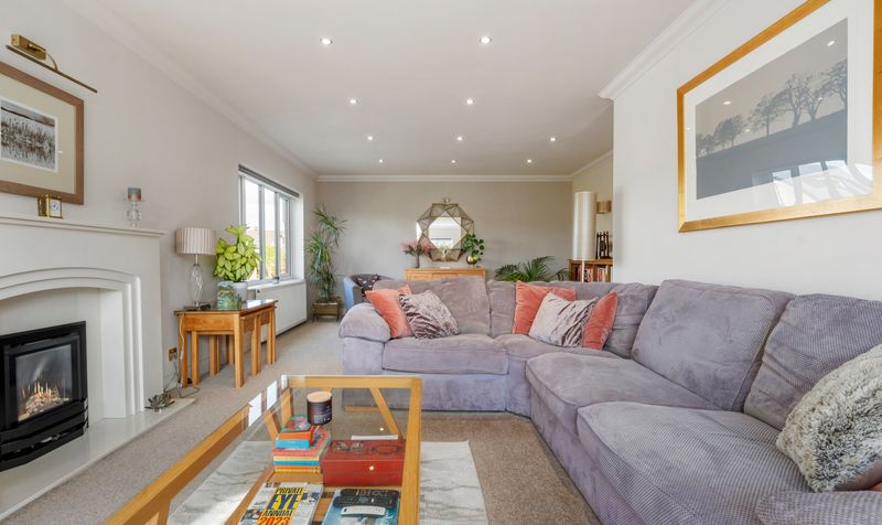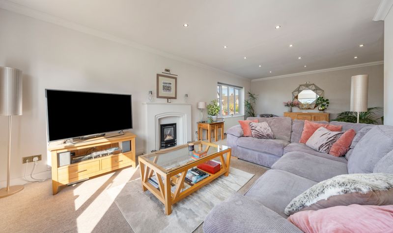Situated to the front left of the home is a spacious 24ft lounge. The living room is neutrally decorated, providing a versatile backdrop that complements various design styles. It features spotlights that enhance the space with ample lighting, allowing for a bright and airy feel. A prominent feature fireplace serves as a focal point, adding character to the room while offering a cosy atmosphere for relaxation and gatherings.