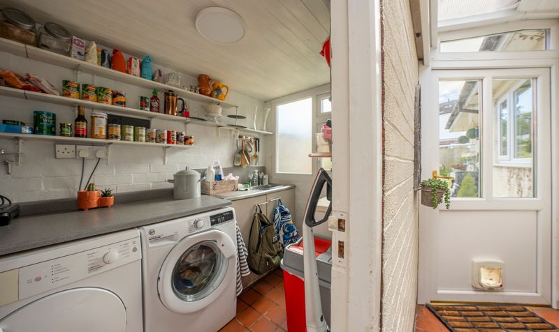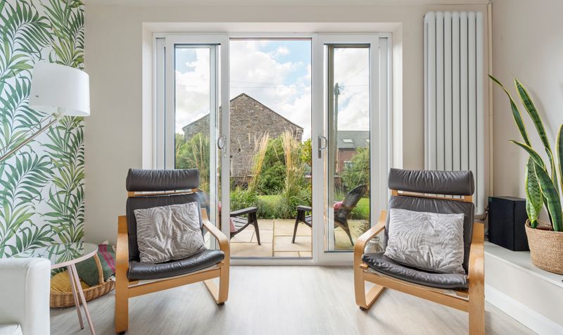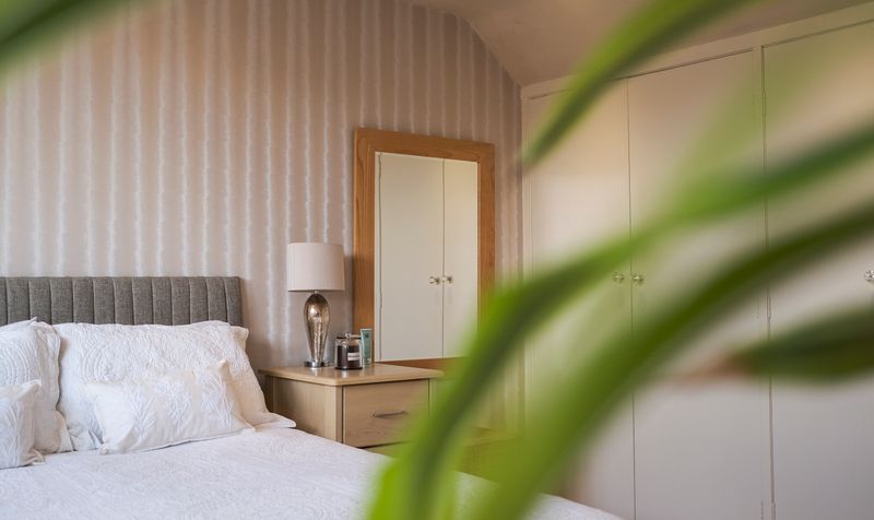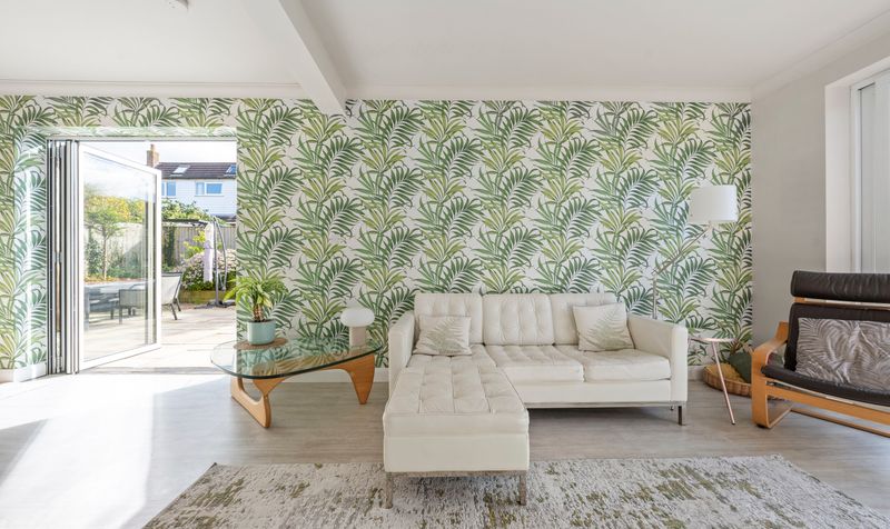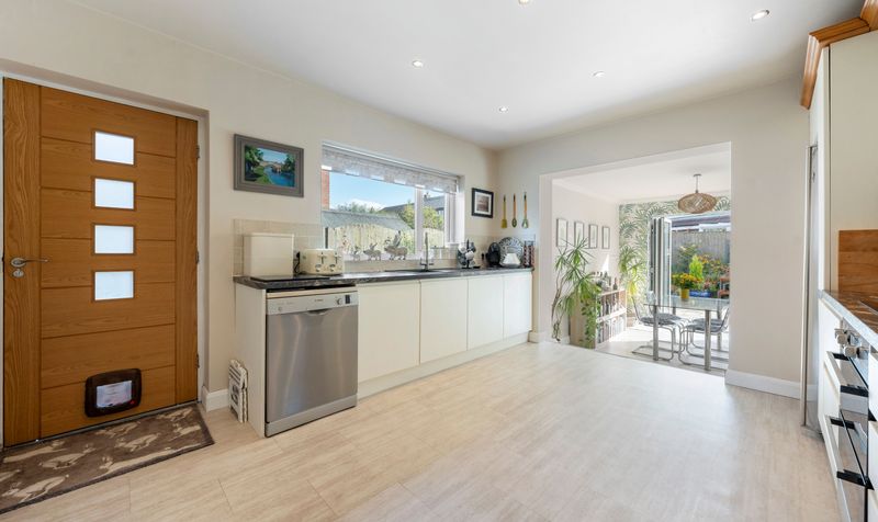 Additionally, there is a large family room with open access to the kitchen and bi-fold doors leading to the gardens, as well as a utility room. The kitchen features modern cream handless units that provide a sleek and streamlined appearance. The contrasting marble-effect worktop adds a touch of elegance while offering ample workspace for culinary tasks. The kitchen is designed in an open-plan layout that seamlessly integrates with the living area, creating a spacious and inviting environment. The living space is a beautiful versatile area allowing space for relaxation and dining. Large windows provide views of the outside, alongside bifolding doors, allowing plenty of natural light to fill the space and connecting the interior with the outdoors. This design promotes a sense of openness and functionality, making it ideal for both everyday living and entertaining.