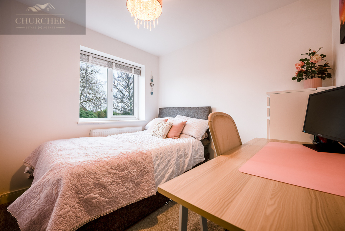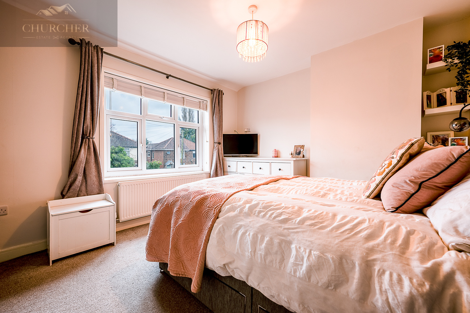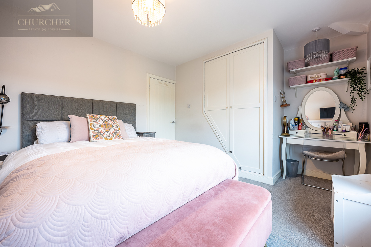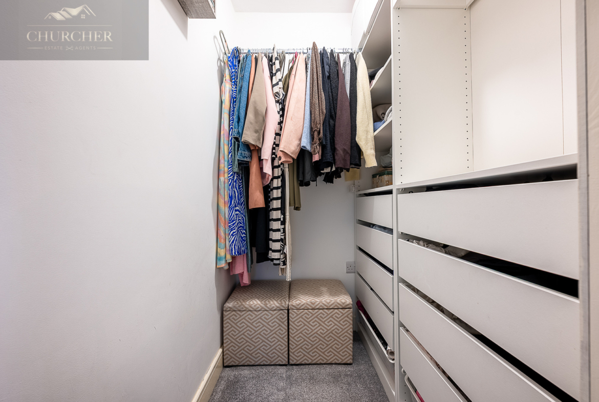 Upstairs, the main bedroom is a beautifully presented and spacious retreat, filled with natural light from the large window overlooking the front. Soft neutral tones and plush carpeting create a calm and relaxing atmosphere. The room also benefits from access to a dedicated dressing area with fitted wardrobes and shelving, providing excellent storage and organisation.