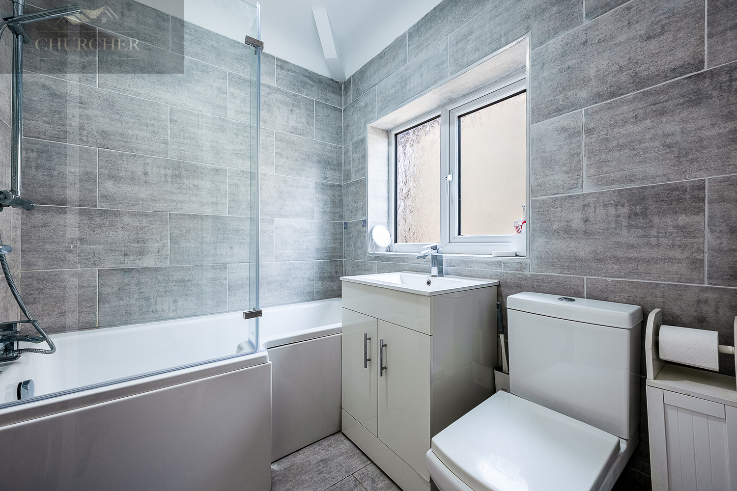 The family bathroom is finished to a modern standard, featuring contemporary tiling, a bath with overhead shower and glass screen, vanity unit and WC, all presented in a clean and neutral palette.