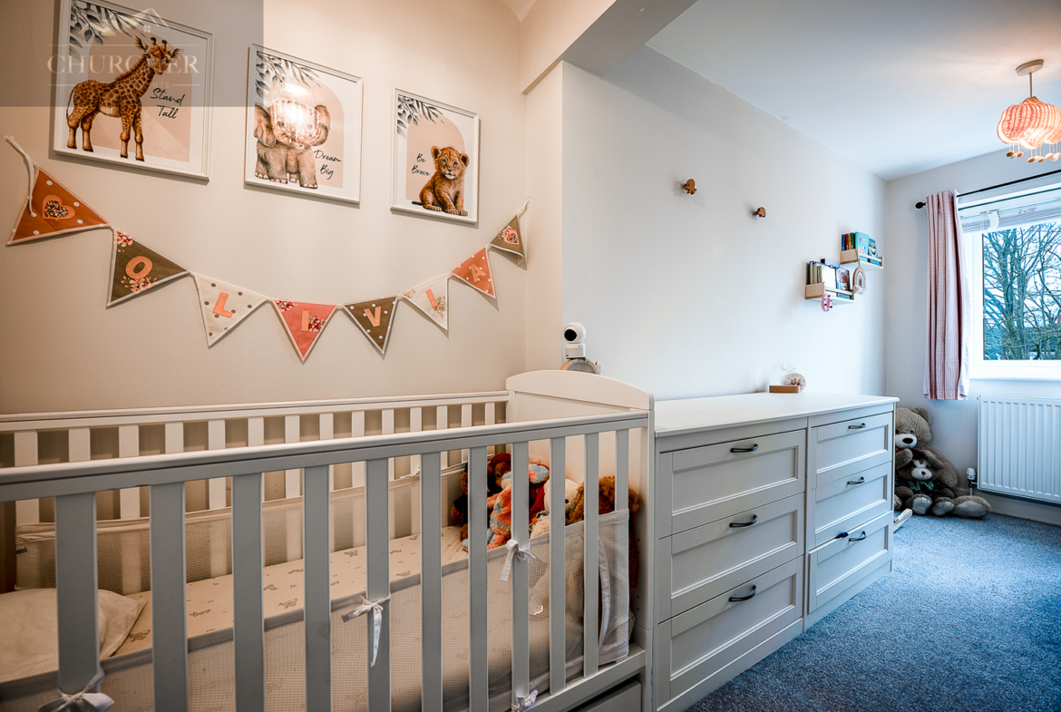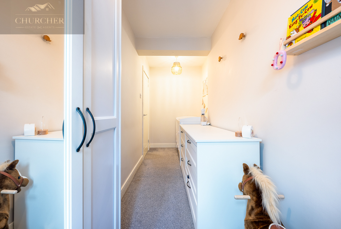 The second bedroom is another generous double, tastefully decorated and offering built-in storage along with space for additional furnishings. The third bedroom is currently styled as a nursery but would equally make an ideal child’s bedroom, guest room or home office.