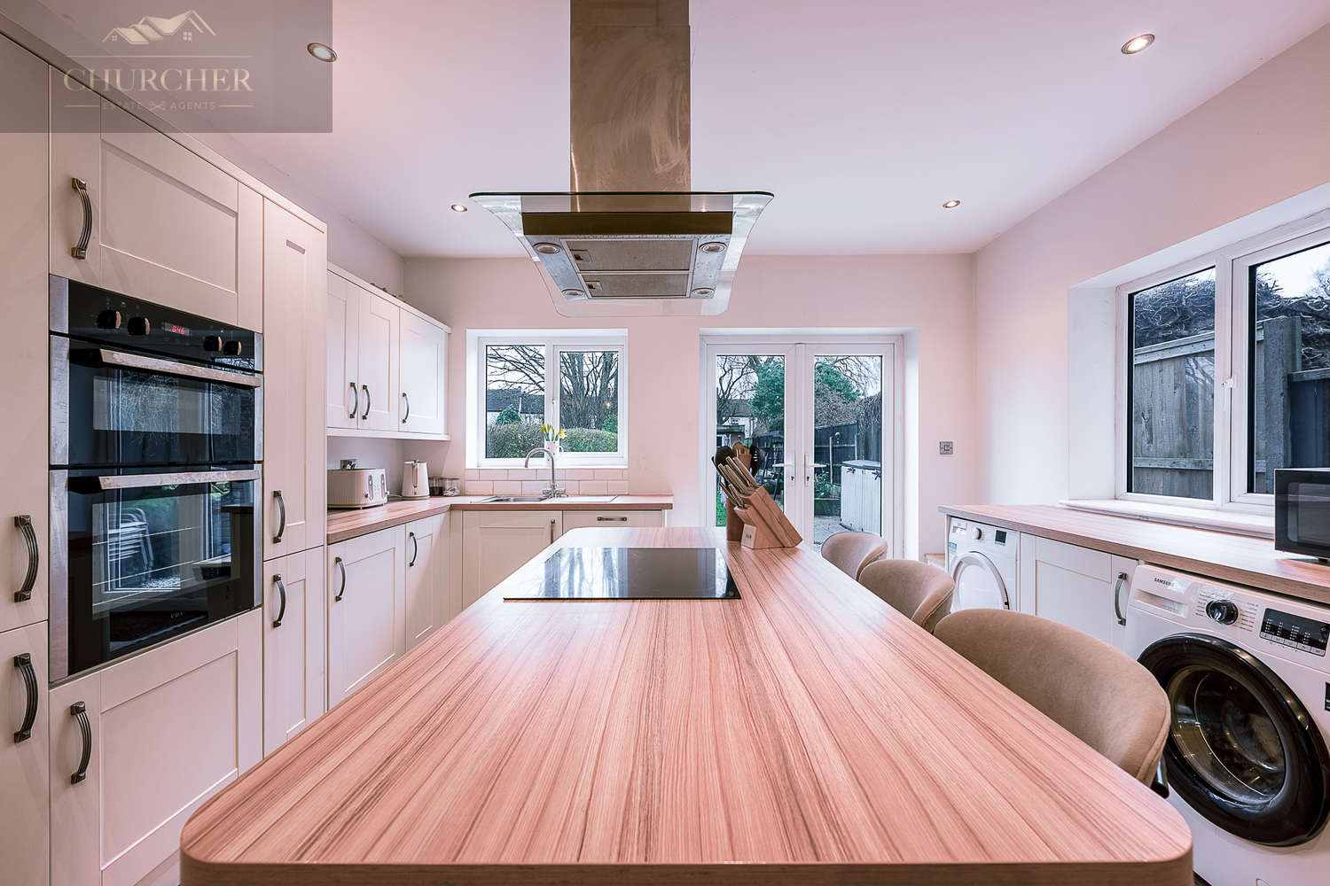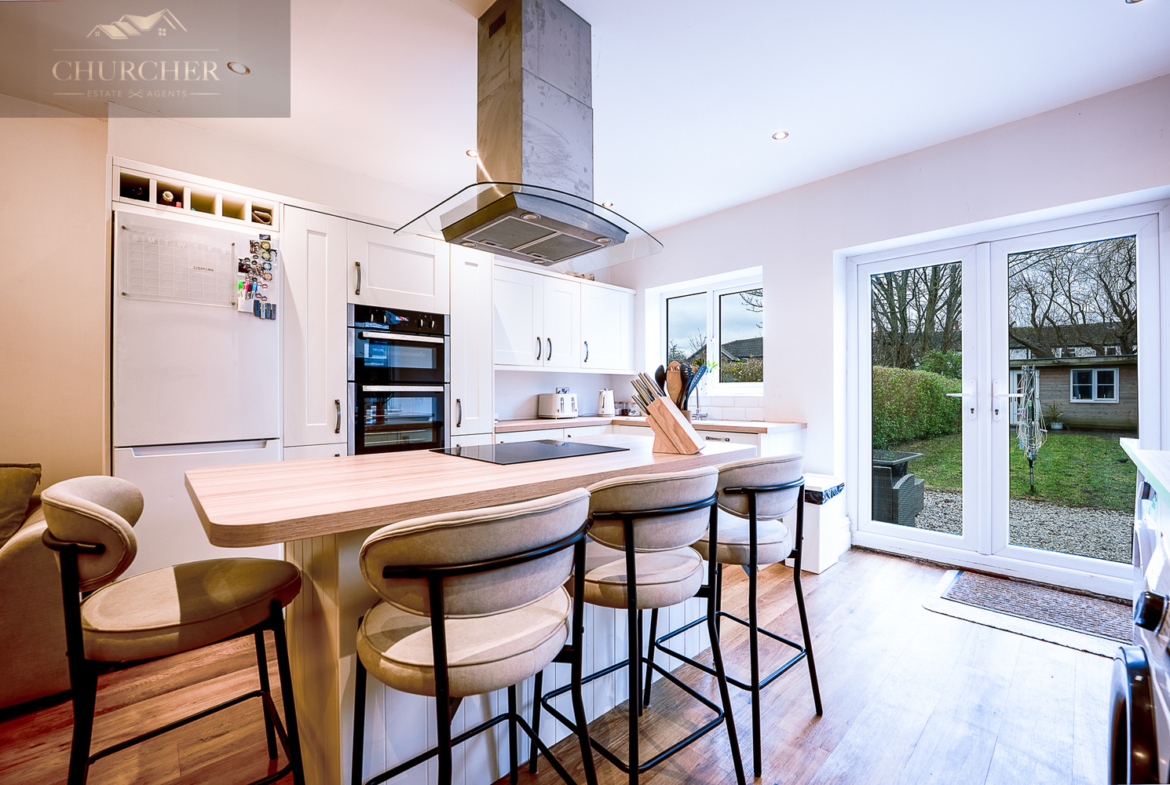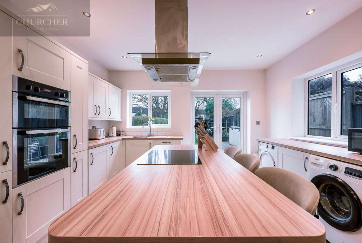 To the rear, the home opens into a superb open-plan kitchen and dining area designed with modern living in mind. The kitchen is fitted with shaker-style cabinetry, quality work surfaces and integrated appliances, all centred around a substantial island with breakfast seating. Contemporary lighting and a statement extractor hood above the island further enhance the space. There is room for a dining table and additional seating, creating a sociable hub ideal for both everyday family life and entertaining. French doors open directly onto the rear garden, allowing for seamless indoor-outdoor living.