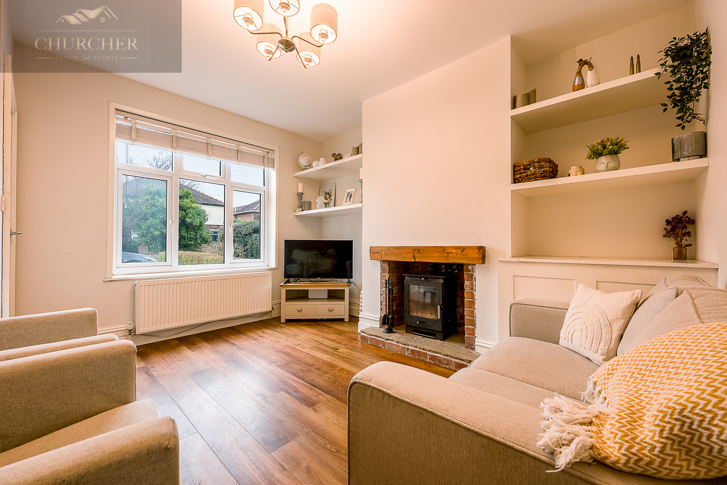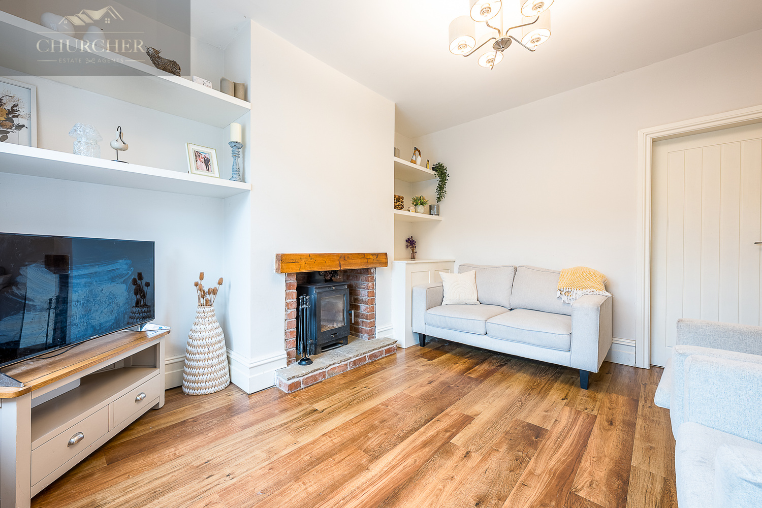 Upon entering, the lounge is positioned to the front of the home and offers a cosy yet stylish living space. A feature fireplace with exposed brick surround and wooden mantle forms a charming focal point, while fitted shelving adds character and practicality. The large front window allows plenty of natural light to pour in, enhancing the neutral décor and warm wood-effect flooring, making this an inviting space to relax and unwind.