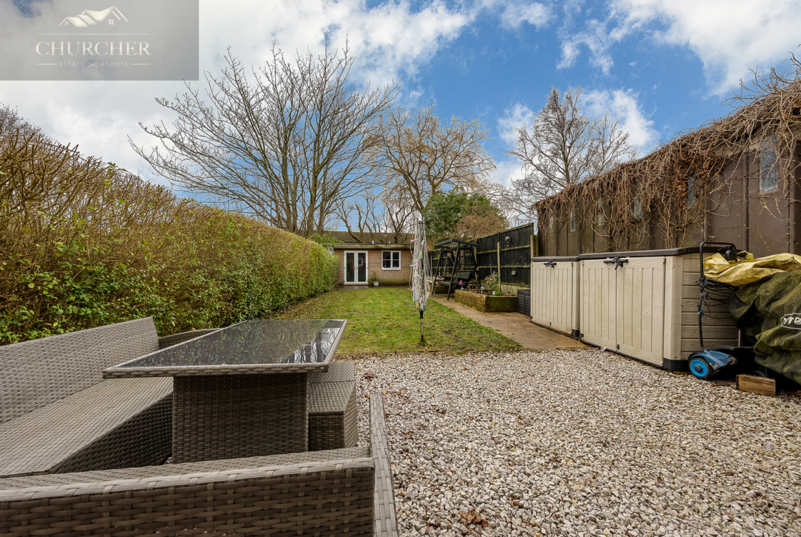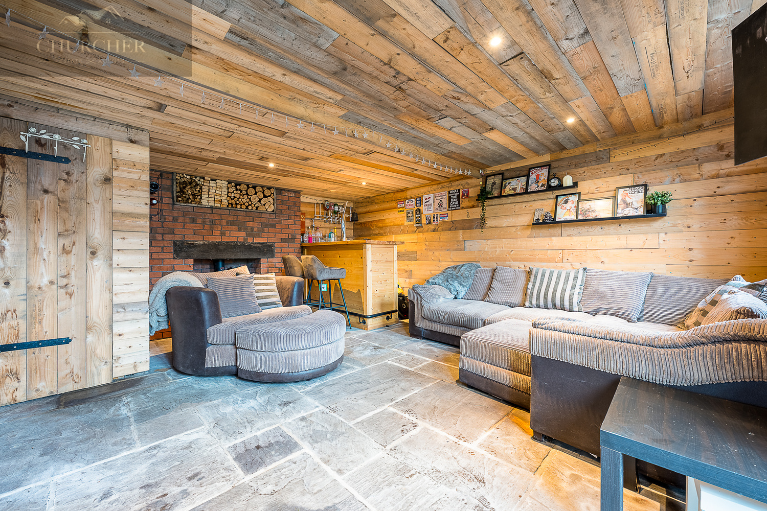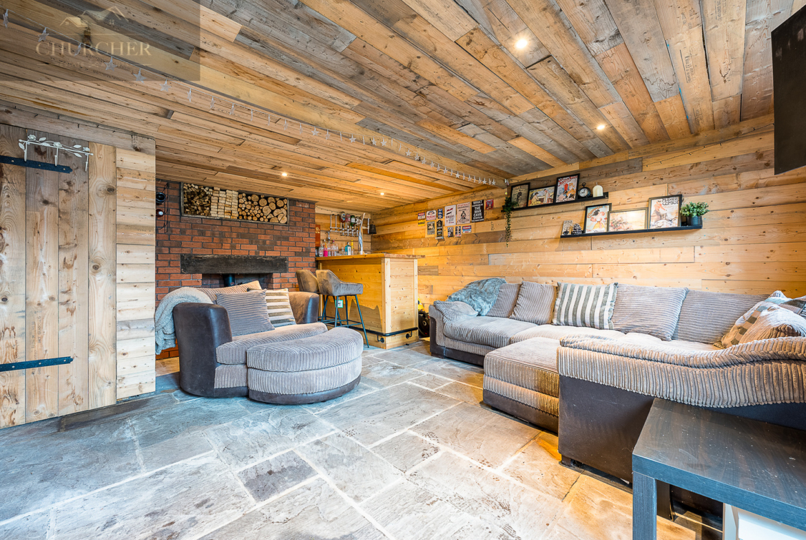 Externally, the rear garden is a fantastic size and offers a combination of patio and lawned areas, bordered by mature hedging for privacy. The patio provides the perfect setting for outdoor dining and entertaining, while the lawn offers space for children to play. To the rear of the garden sits an impressive garden room, fully transformed into a stunning additional living space. With its rustic wood panelling, feature brickwork, bar area and comfortable seating, it creates a unique and versatile environment ideal for entertaining, relaxing or even working from home.