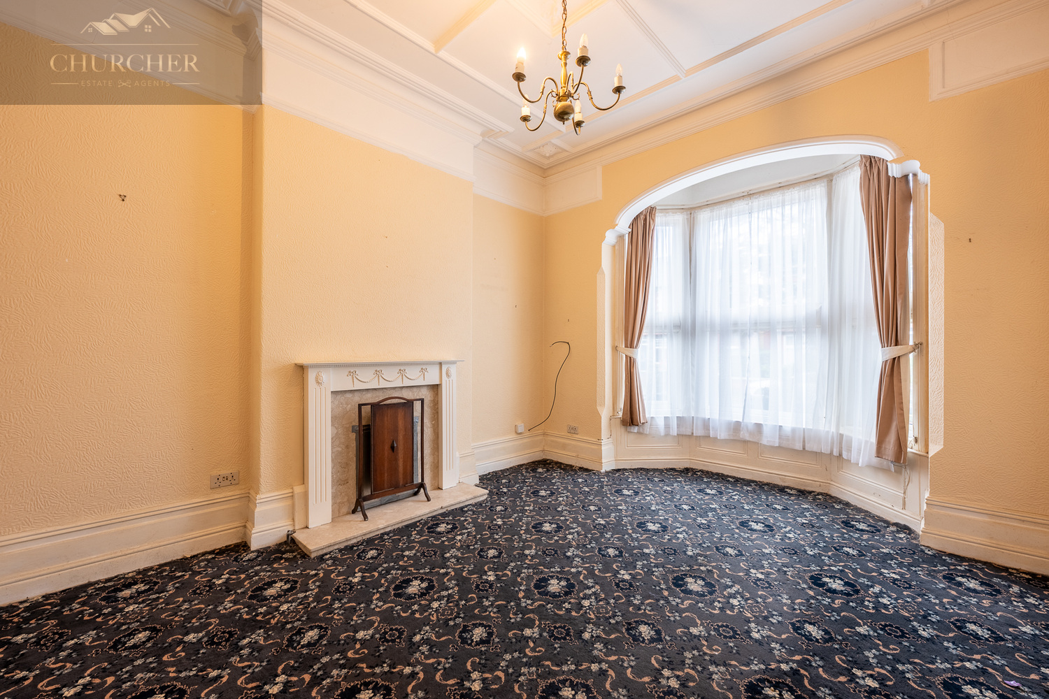 To the front, a spacious reception room benefits from a large bay window allowing for good natural light. Original features such as high ceilings and a fireplace remain in place. A second reception room, also of generous proportions, offers additional living space and could serve a variety of purposes depending on requirements.