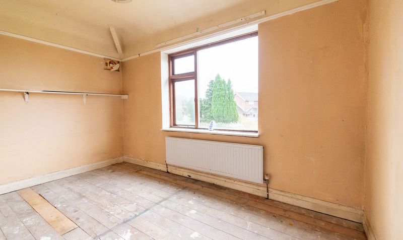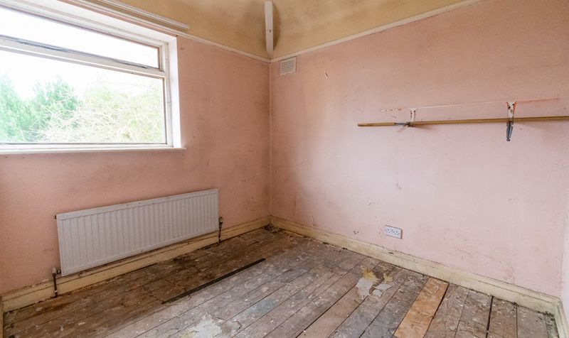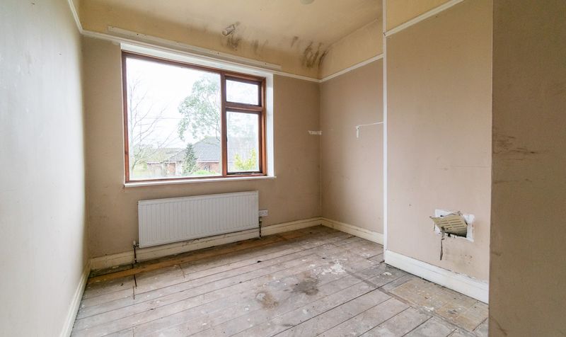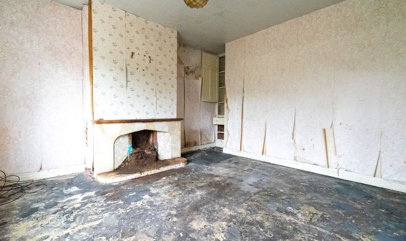 Internally, the accommodation begins with a central hallway and staircase rising to the first floor. The lounge is positioned to the front of the home and features a traditional fireplace and a large window overlooking the garden, allowing natural light to fill the space. While requiring refurbishment, the proportions of the room provide an excellent foundation for a cosy yet spacious living area.