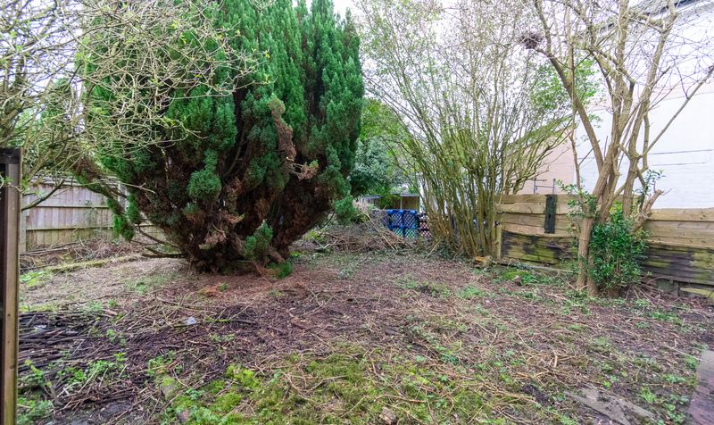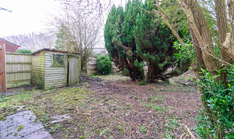 Externally, the rear garden is generous in size and filled with mature trees and shrubs, offering significant scope for landscaping. A timber shed sits to one side, and once cleared and redesigned, the space has the potential to become a fantastic private garden ideal for families.