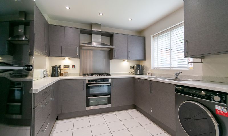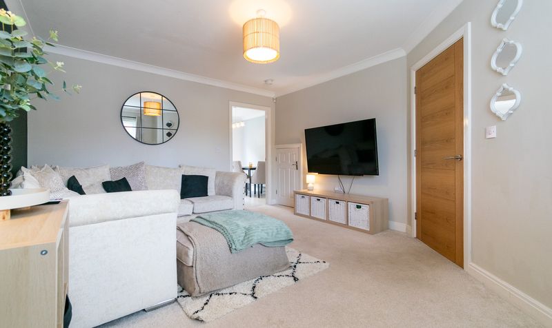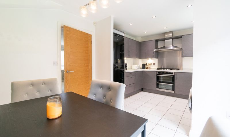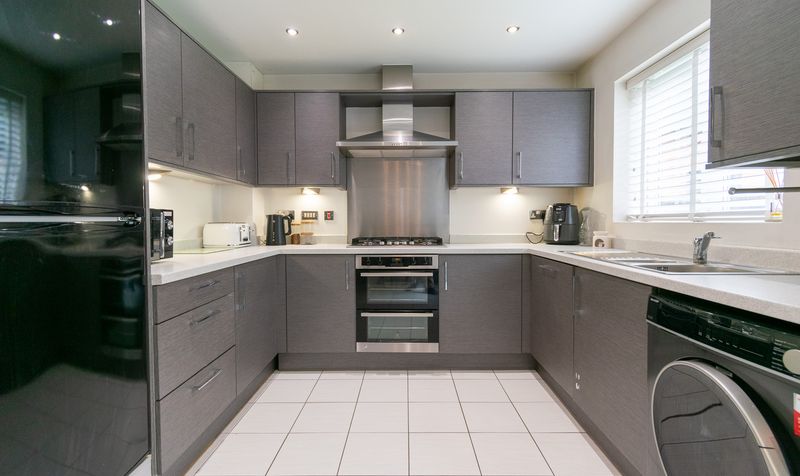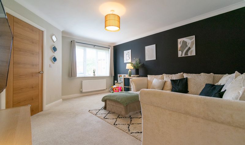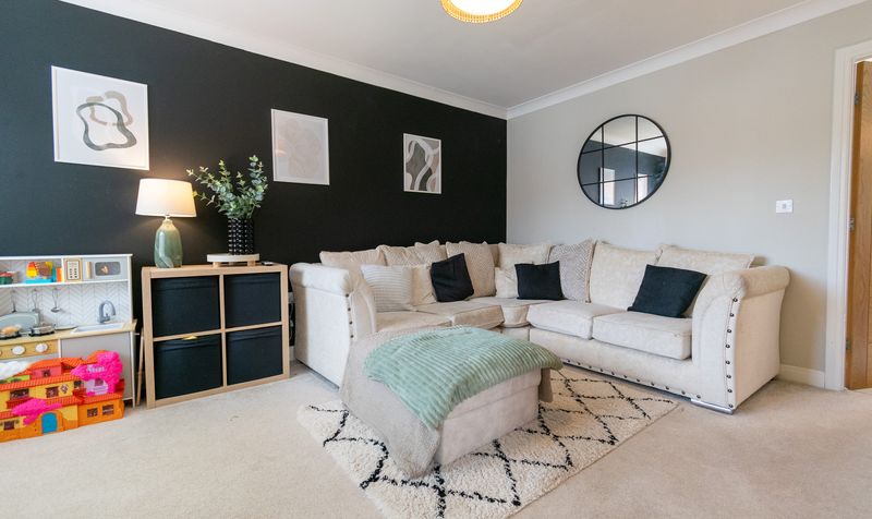 To the front of the property lies a spacious and elegant lounge, perfect for family living. This bright and airy room benefits from a large window, soft neutral décor, and a feature dark wall adding contemporary contrast. The layout flows through to the rear of the home where you’ll find a modern open-plan kitchen and dining room, ideal for entertaining and day-to-day family life.