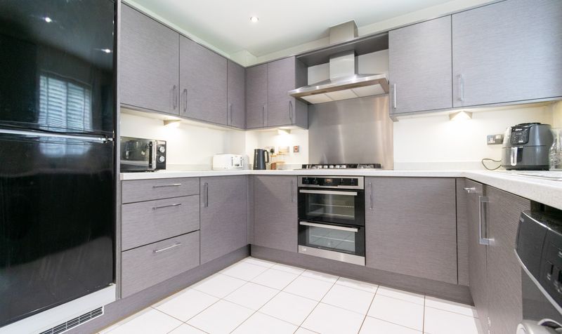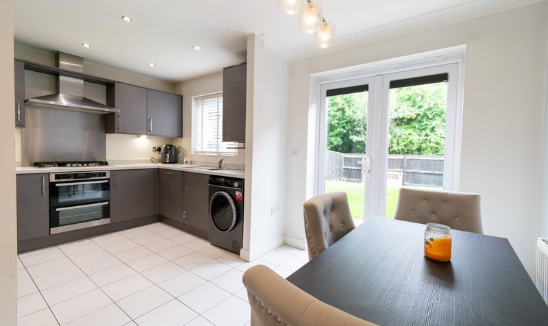 The kitchen is beautifully finished with sleek grey cabinetry, integrated appliances including a double oven and gas hob, and a stainless-steel extractor and splashback. A window above the sink provides views over the rear garden. The dining area, positioned adjacent, features French doors leading out to the patio, bringing the outside in and creating a lovely connection to the garden.