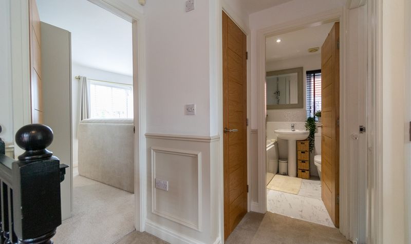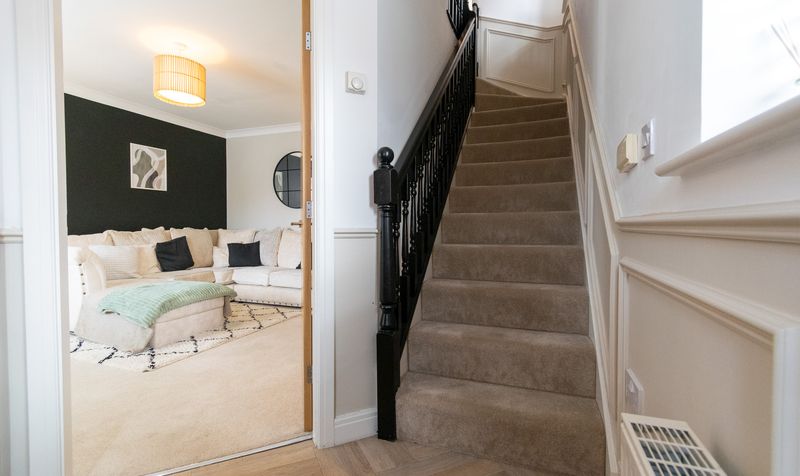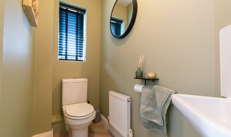 Upon entering the property, you are greeted by a welcoming hallway with wood-effect flooring, decorative panelled walls, and a carpeted staircase rising to the first floor. A handy downstairs WC is positioned just off the hall and is beautifully styled in calming sage tones with a sleek wall-mounted basin and modern fittings.