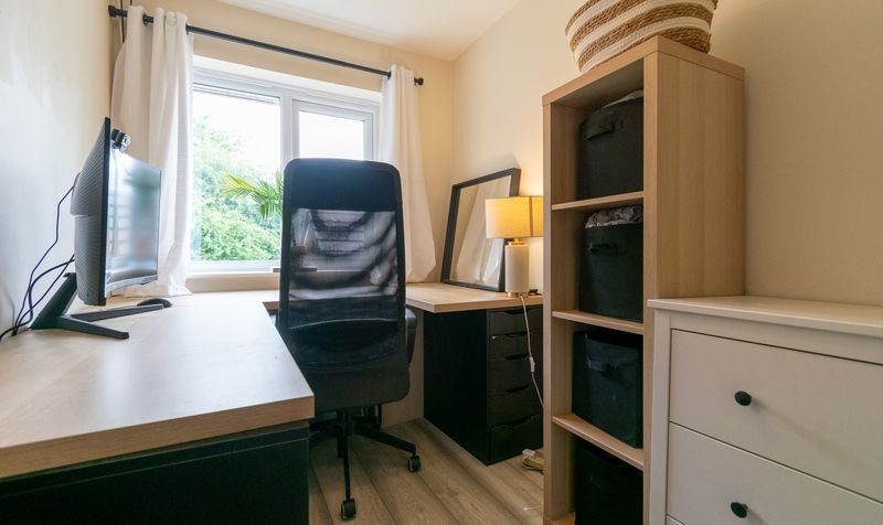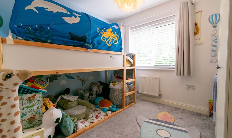 Upstairs, the first-floor landing provides access to three well-proportioned bedrooms. The principal bedroom is set to the front and enjoys a stylish, calming interior with ample space for furnishings. The second bedroom overlooks the rear garden and is perfect as a child’s bedroom or guest room, while the third bedroom, currently used as a home office, would make an ideal nursery or study space.