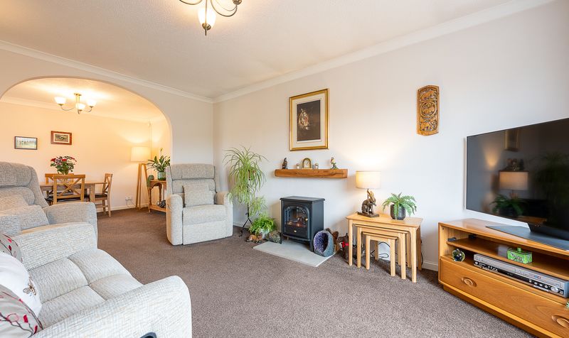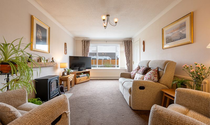Upon entering, you are welcomed into a central hallway that provides access to all main living areas, offering a practical and well-balanced layout. The lounge is a bright and comfortable space, featuring a large front-facing window that fills the room with natural light. A focal fireplace with a stove-style feature creates a cosy atmosphere, while the neutral décor enhances the sense of space and warmth. An open archway leads through to the dining room, creating a seamless flow ideal for both everyday living and entertaining.
