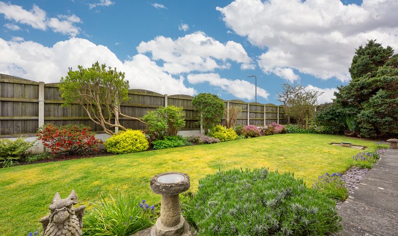 Externally, the rear garden is a standout feature—beautifully maintained and mainly laid to lawn, with well-stocked borders of mature shrubs and planting providing colour and privacy. The garden extends to both the side and rear of the property, offering a wonderfully secluded and sun-filled setting ideal for relaxing or entertaining. A patio area provides the perfect space for outdoor seating, while a garden shed with lighting and power adds further convenience. The property also benefits from a garage, complete with lighting and power, making it ideal for storage, a workshop or secure parking.