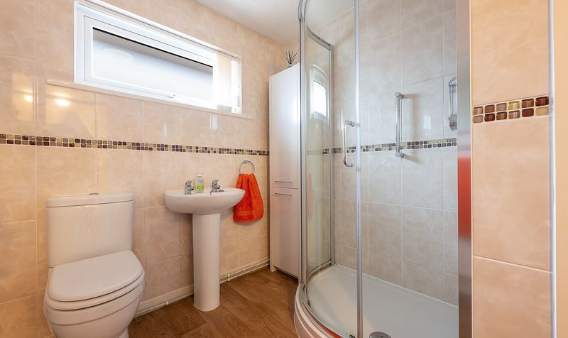 The shower room is fitted with a modern suite, including a corner shower enclosure, wash basin and WC, finished with contemporary tiling. A useful internal store adds further practicality to the home.