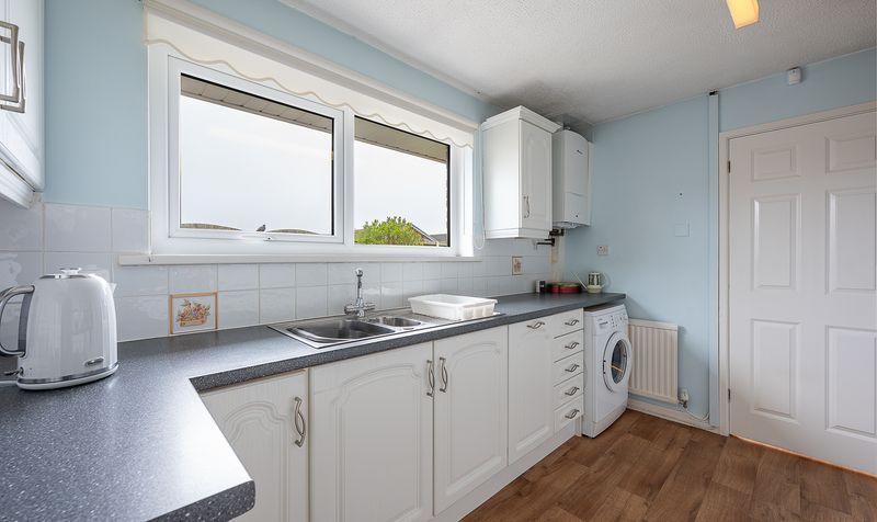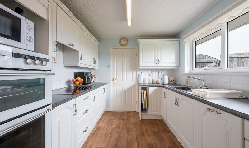 The kitchen is fitted with a range of classic units and work surfaces, providing generous storage and preparation space. With windows overlooking the side and rear, the room is bright and functional, with space for appliances and convenient access to an external door.