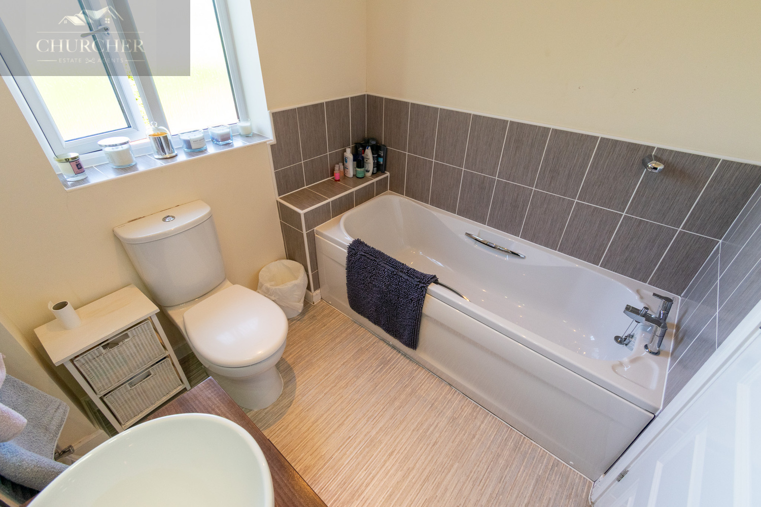 The family bathroom is stylishly finished and thoughtfully designed to offer both comfort and practicality. A crisp, modern aesthetic is achieved through the use of soft, grey-toned wall tiles paired with a clean white suite, creating a calming and contemporary environment.