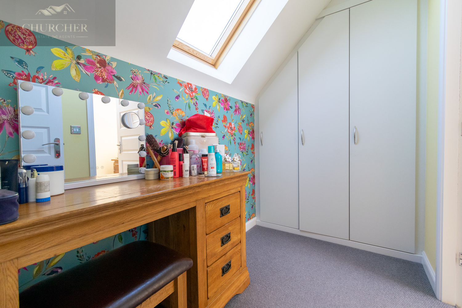 The second floor reveals a stunning principal bedroom suite with sloping ceilings, skylights, and a colourful feature wall that brings charm and individuality. A dedicated dressing area includes built-in wardrobes and a vanity setup, making this an ideal retreat. Off of the dressing room is an ensuite bathroom- perfect for convenience and comfort in this elegant top-floor retreat.
