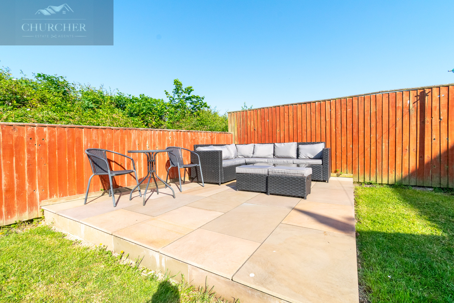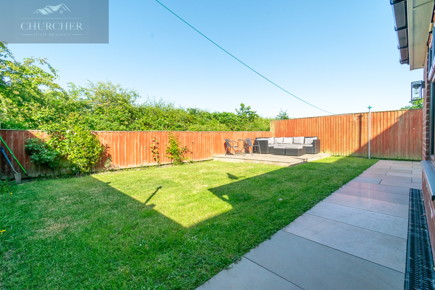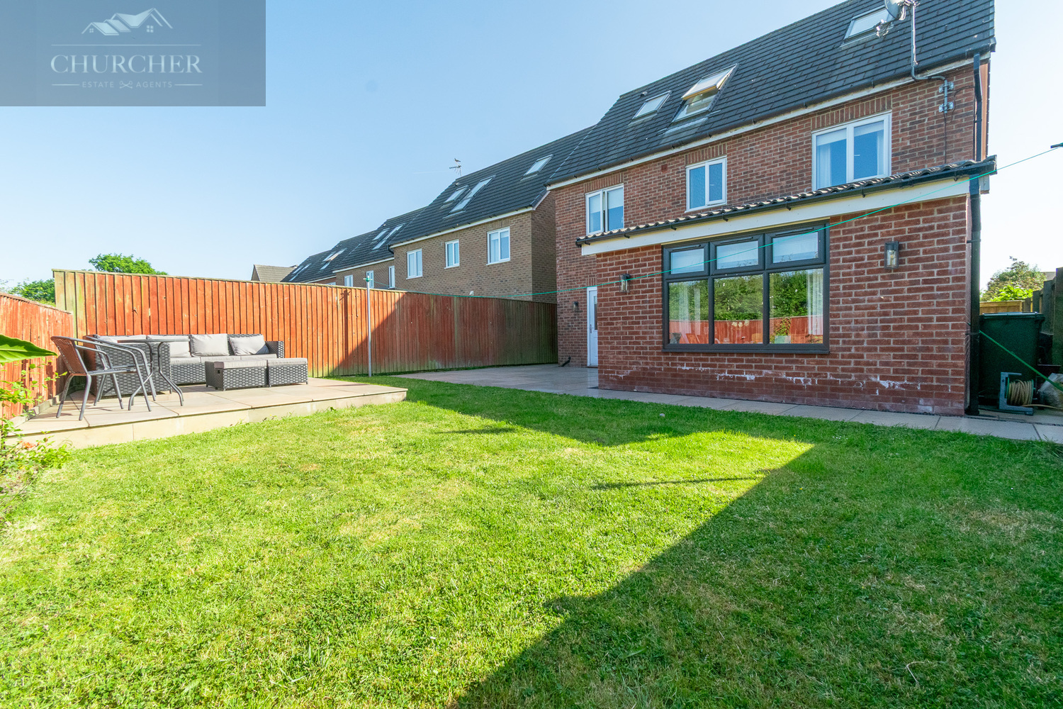 Externally, the rear garden is perfect for family life and entertaining. There is a spacious paved patio area directly accessed from the bi-fold doors-ideal for alfresco dining-and a raised seating area at the back with rattan furniture, providing a private spot for relaxing. The lawn is bordered by mature greenery and enclosed by fencing, making it safe for children and pets alike.