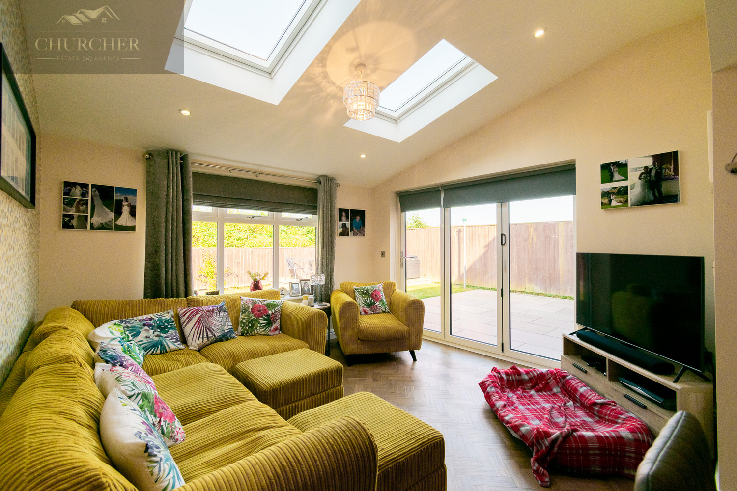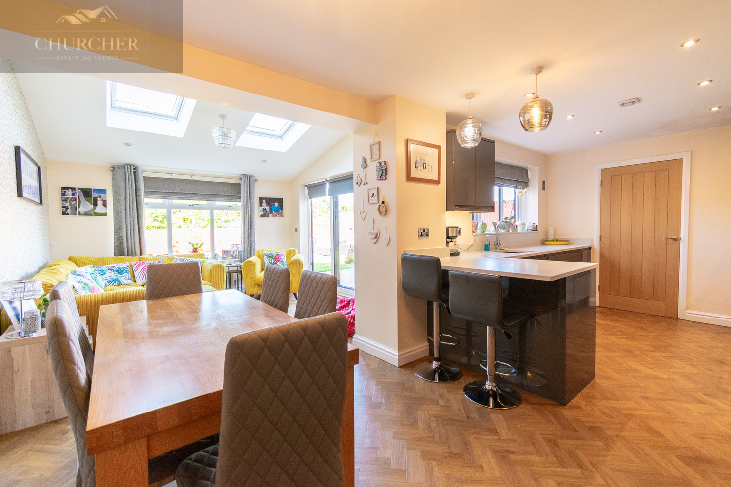 This room flows effortlessly into a family living space, with skylights overhead and full-width bi-fold doors opening onto the rear patio, flooding the room with natural light. A striking mustard corner sofa and vibrant soft furnishings add character and warmth, making it a welcoming space for all seasons. The family room features beautiful herringbone-effect flooring that not only adds a touch of timeless elegance but also provides a practical and durable surface ideal for busy family life. This stylish flooring seamlessly continues from the kitchen and dining area, helping to unify the entire open-plan space and enhance the sense of flow throughout the ground floor.
