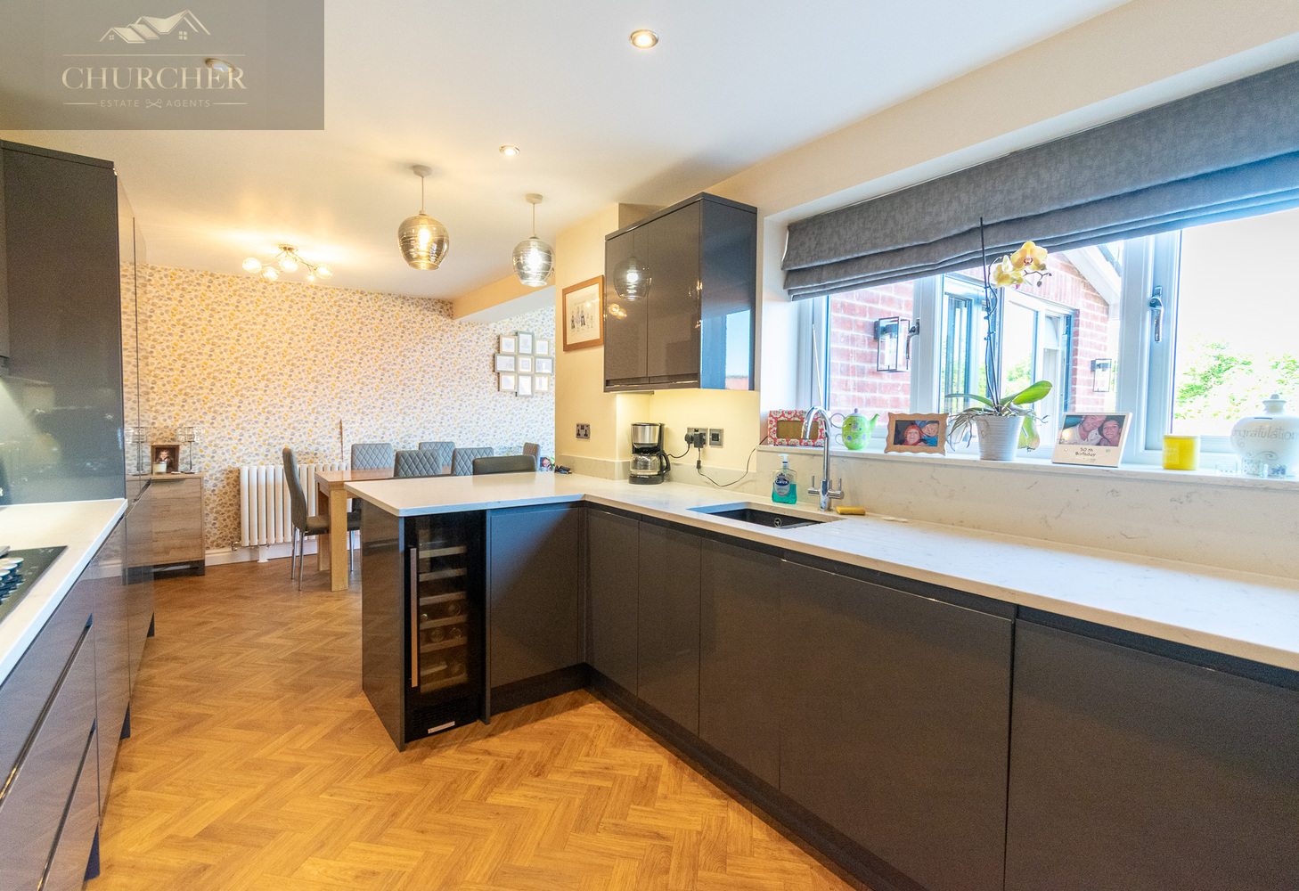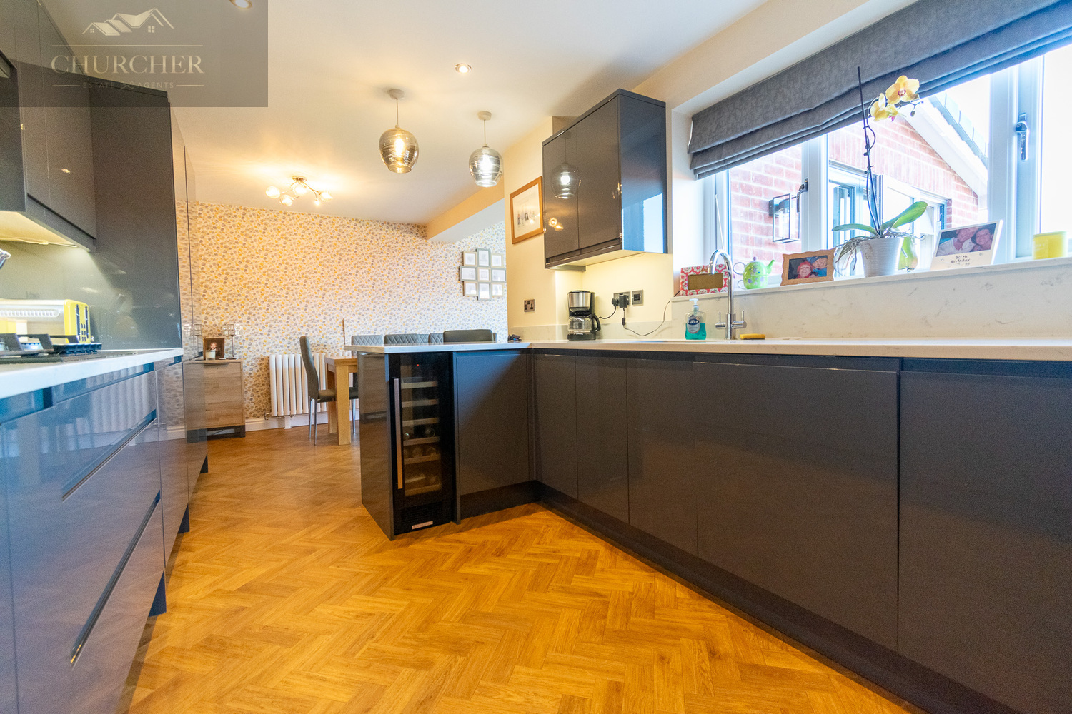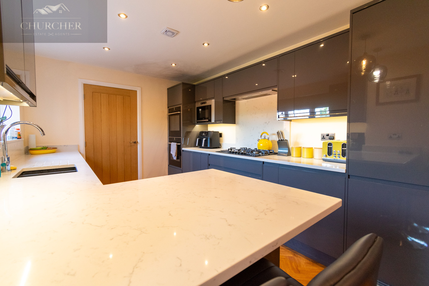 To the rear of the property is a truly outstanding open-plan kitchen, dining, and living space-undoubtedly the heart of the home. This contemporary showpiece is thoughtfully designed to balance style, practicality, and sociability. Featuring sleek, high-gloss grey cabinetry that runs along two walls, the space offers an abundance of storage, all seamlessly integrated for a streamlined finish. The cabinetry is complemented by crisp white marble-effect worktops, creating a clean and elegant contrast that feels both modern and timeless. At the centre of the kitchen is a striking peninsula island with waterfall-edged countertops, providing additional workspace as well as an inviting breakfast bar. It’s the perfect spot for casual dining, morning coffee, or entertaining guests while preparing meals. Overhead, a pair of stylish pendant lights add a warm ambiance and elevate the overall aesthetic.