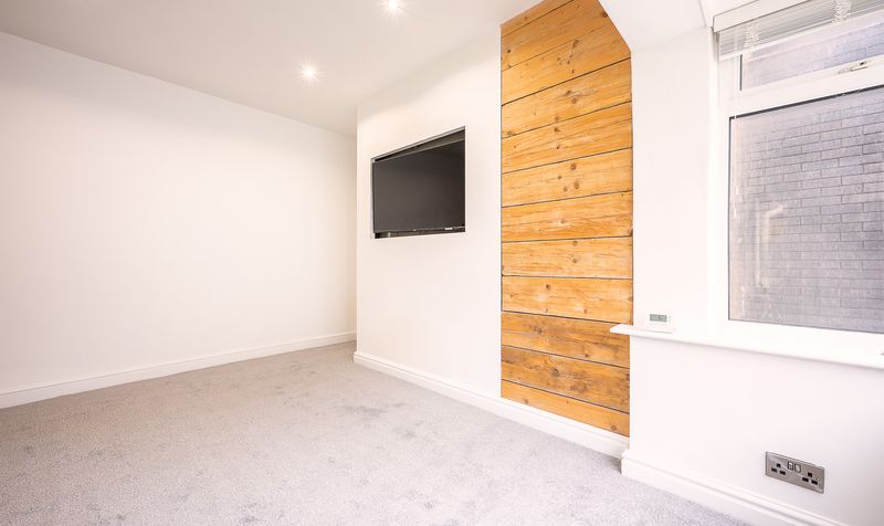 At the rear of the property, the lounge is a bright and inviting space, beautifully presented with soft neutral décor and plush grey carpeting that enhances the sense of warmth and comfort. A large bay window floods the room with natural light, creating a spacious and airy feel throughout the day. The clean, modern design is complemented by a feature wall with natural timber panelling and a recessed area housing a wall-mounted television, blending character with contemporary style. Perfect for both relaxing and entertaining, this versatile room serves as the heart of the home.