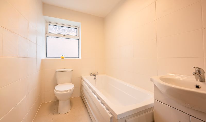 The bathroom is fitted with a modern white suite comprising a panelled bath, vanity washbasin and WC, finished with tiled walls and flooring for a clean, timeless look.
