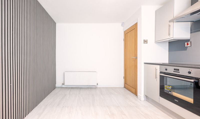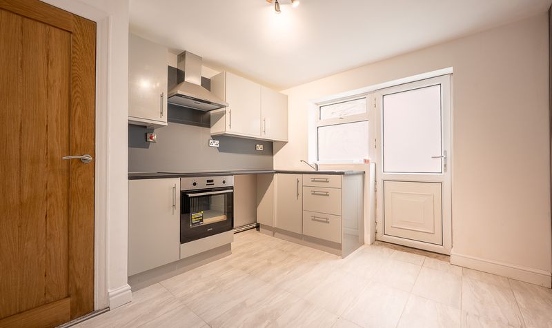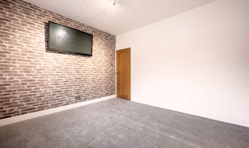 Moving through the property, the stylish kitchen/ diner also sits towards the rear and has been thoughtfully designed with a range of sleek high-gloss units, contrasting worktops and an integrated oven and hob. There’s ample space for dining, enhanced by a statement feature wall that gives the room real character. A door from the kitchen opens directly onto the rear garden, making it ideal for everyday family life and summer entertaining.