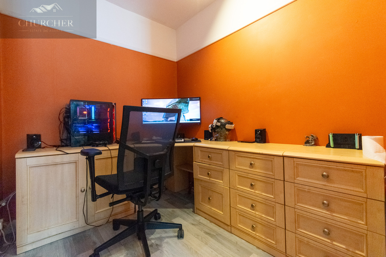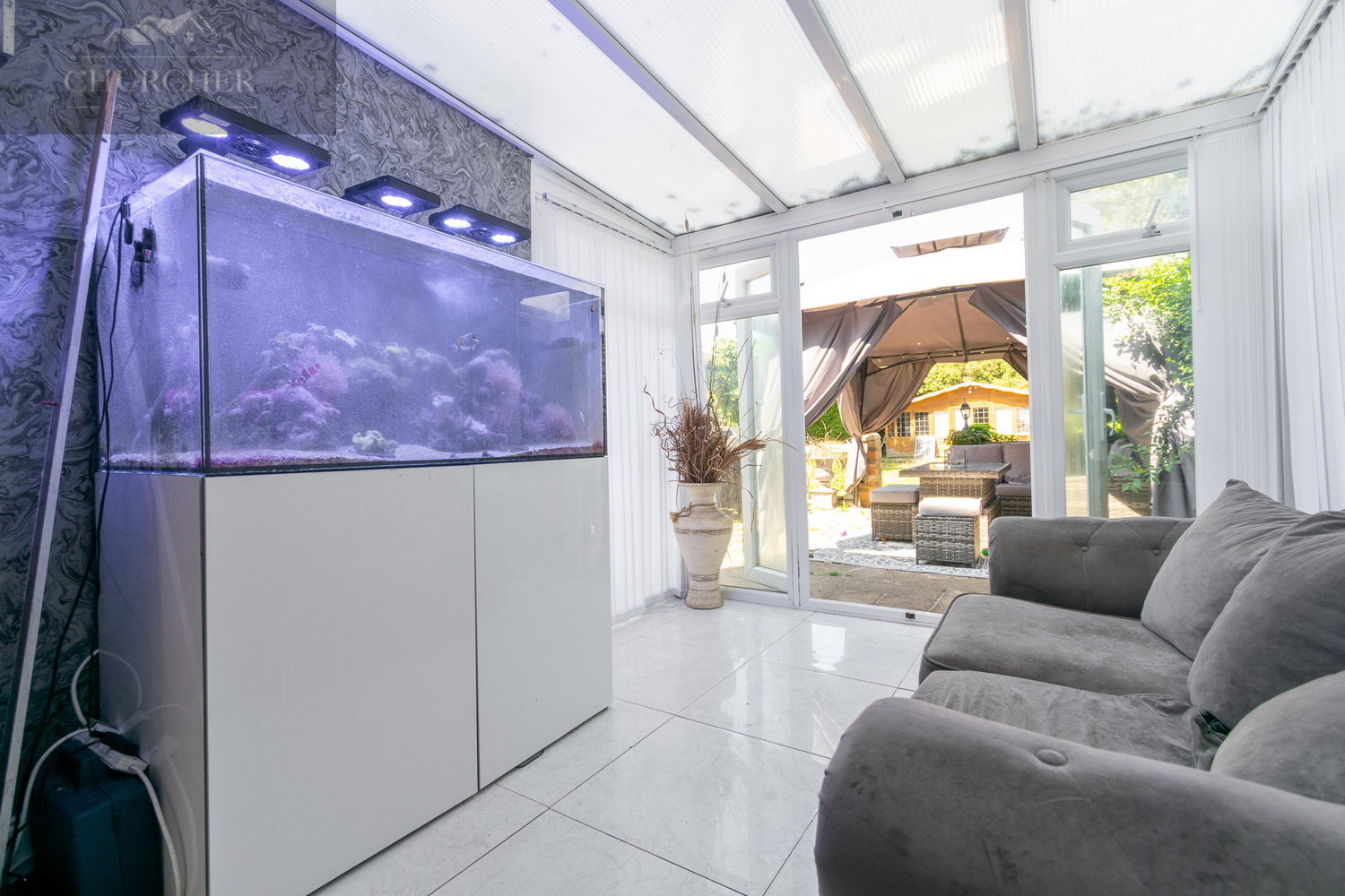 Outside, the rear garden is a standout feature-generous in size and offering both a lawned area and spacious patio, ideal for al fresco dining, entertaining, or family play. At the bottom of the garden, the impressive garden room/summer house has been fully transformed into a dedicated entertainment space, complete with a fitted bar, projector, mood lighting, and a rustic wood-panelled finish-making it the ultimate outdoor retreat. A large pond also adds a tranquil touch to this impressive outdoor space.