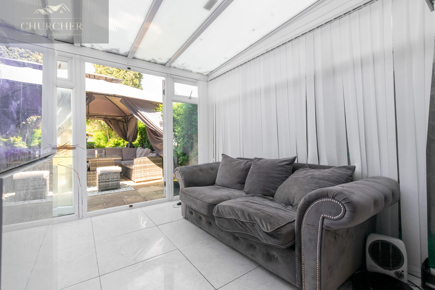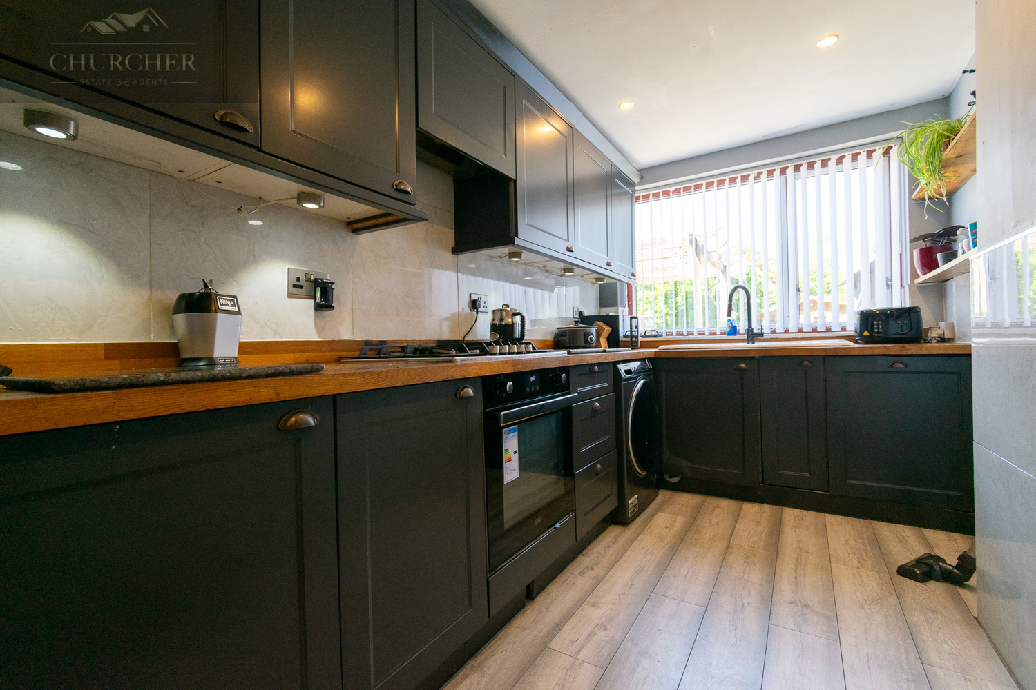 To the rear, the conservatory provides a tranquil, light-filled living space with lovely views over the garden and direct access to the patio-perfect for enjoying the warmer months and extending your living space outdoors. Just off the dining area, the kitchen is sleek and well-equipped, featuring deep grey shaker-style units, solid wood worktops, integrated appliances, a gas hob, and marble-effect splashbacks. A large window above the sink brings in plenty of light, while the wood-effect flooring adds warmth and cohesion to the modern aesthetic.