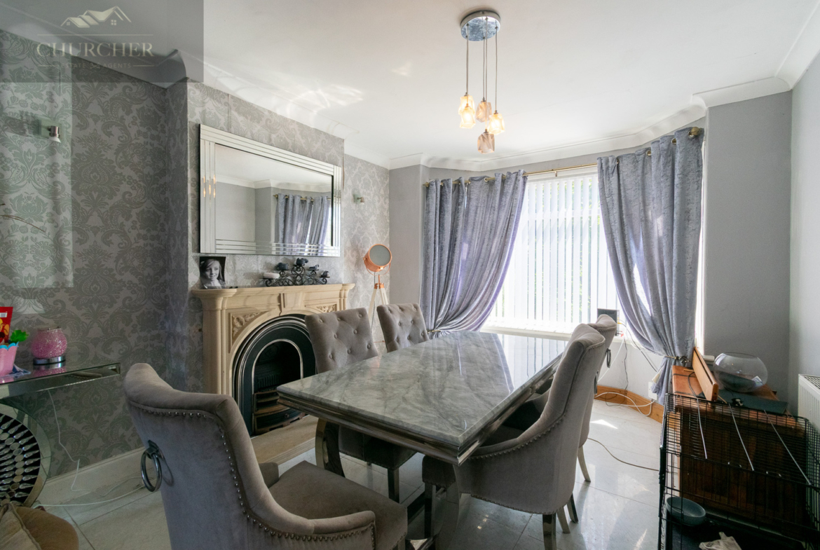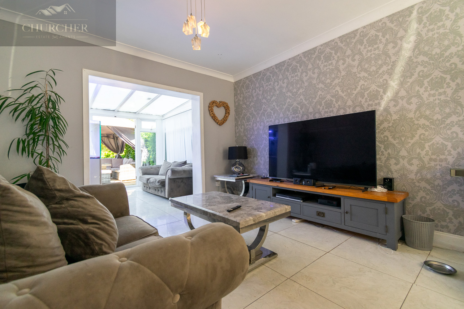 On arrival, the property is set behind a generous paved driveway providing ample off-road parking. Stepping inside, you are welcomed into a bright and inviting entrance hallway, tastefully decorated and finished in stylish grey and wood tones that continue seamlessly throughout the home. To the right, the spacious open-plan lounge and dining room spans the full depth of the house, filled with natural light from the front bay window and rear double doors that open into the conservatory. Elegantly appointed with feature wallpaper, a classic fireplace, tiled flooring, and modern lighting, this room offers an ideal setting for both relaxed family living and entertaining guests.