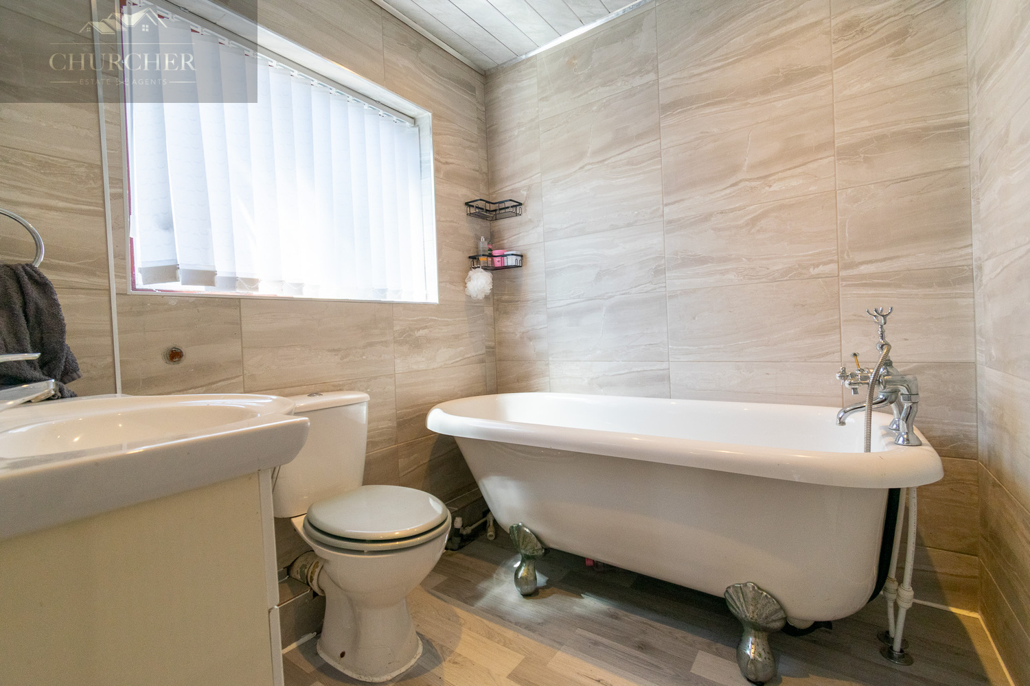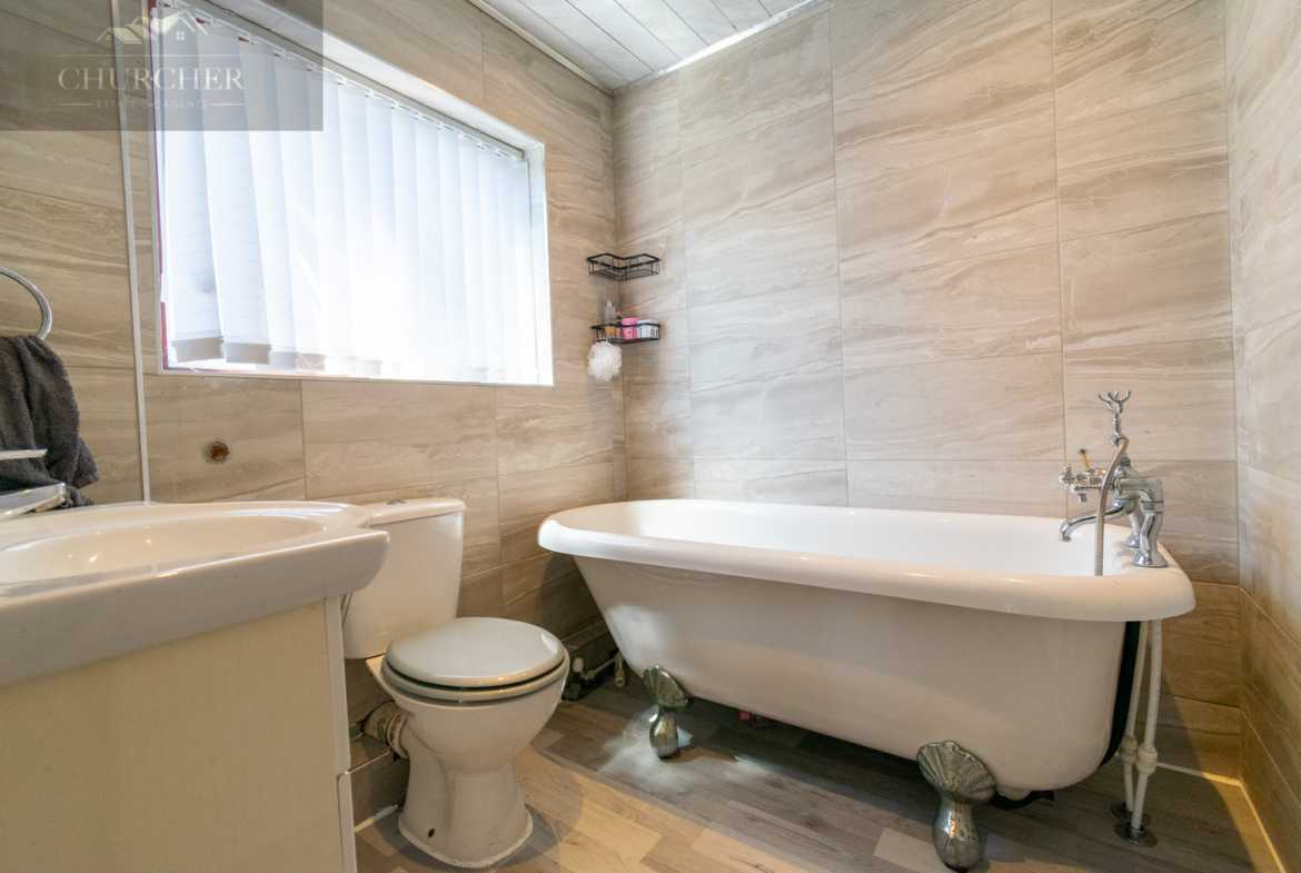 Upstairs, the first-floor landing is bright and airy, illuminated by a side window and giving access to two spacious double bedrooms, a stylish family bathroom, and a single bedroom ideal for use as a nursery, dressing room, or additional office space. The bathroom is beautifully finished, complete with a freestanding clawfoot bath, traditional fittings, and elegant marble-style tiling that exudes luxury. An additional office space also sits on this floor-perfectly suited to home working or study.