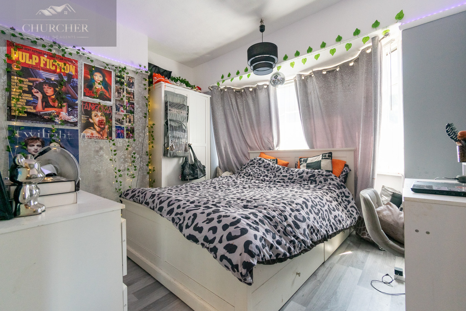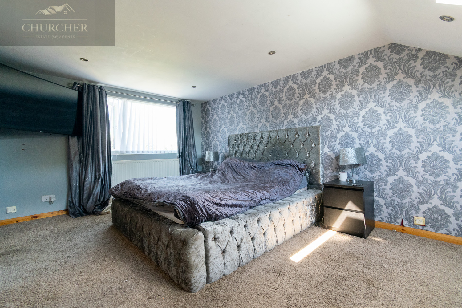 A further staircase leads to the top floor where the large principal bedroom offers a peaceful and private retreat, spanning the full width of the property. This superb space features a walk-in wardrobe, plush carpeting, feature wall décor, and a contemporary en-suite shower room with sleek tiling and modern fittings.