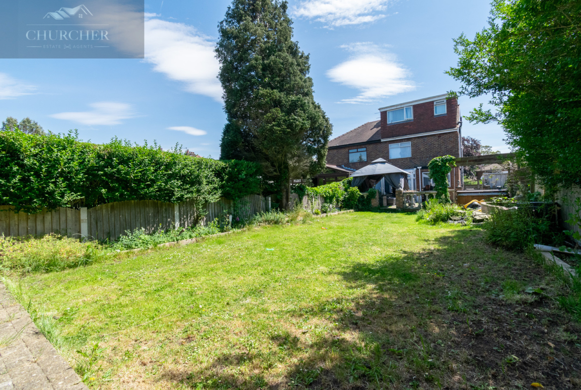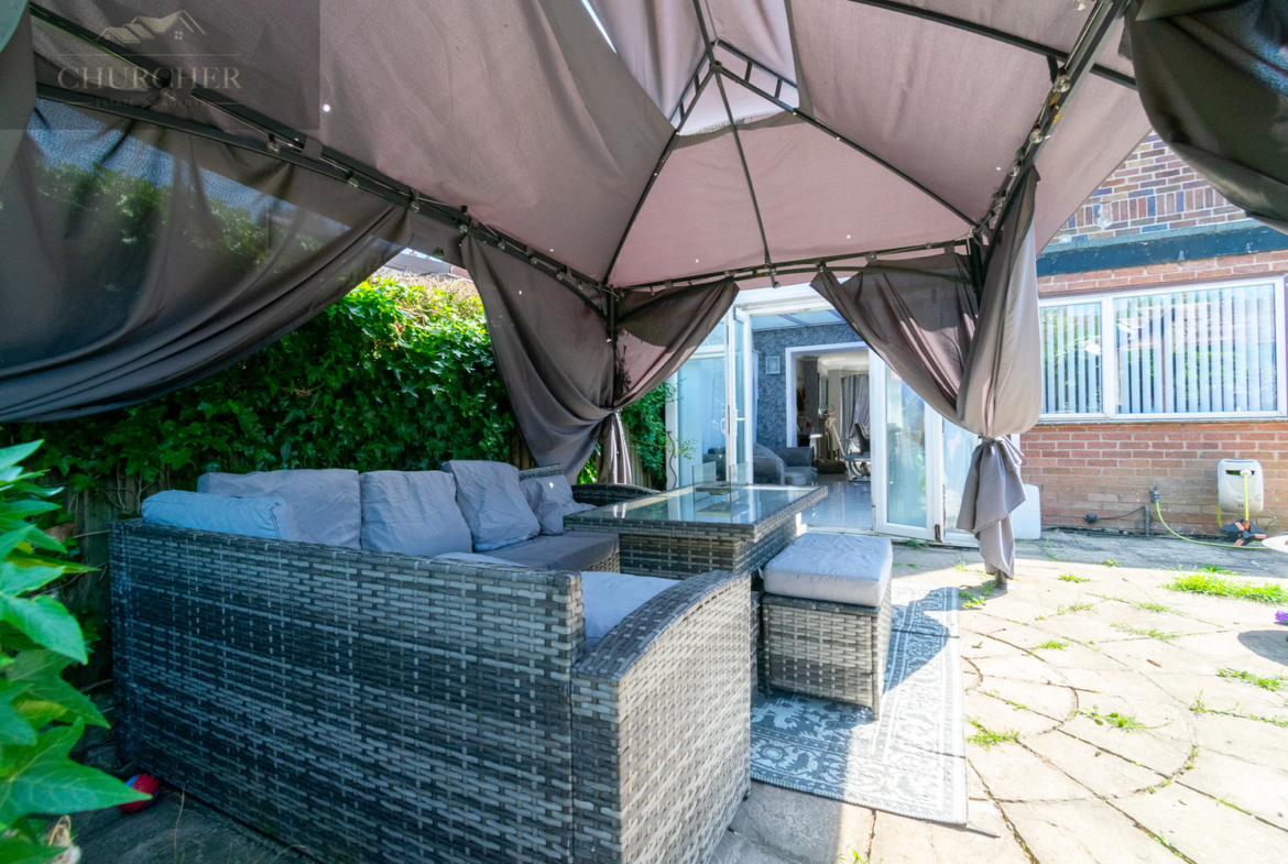 - Large rear garden with patio, lawn, pond and garden room/bar