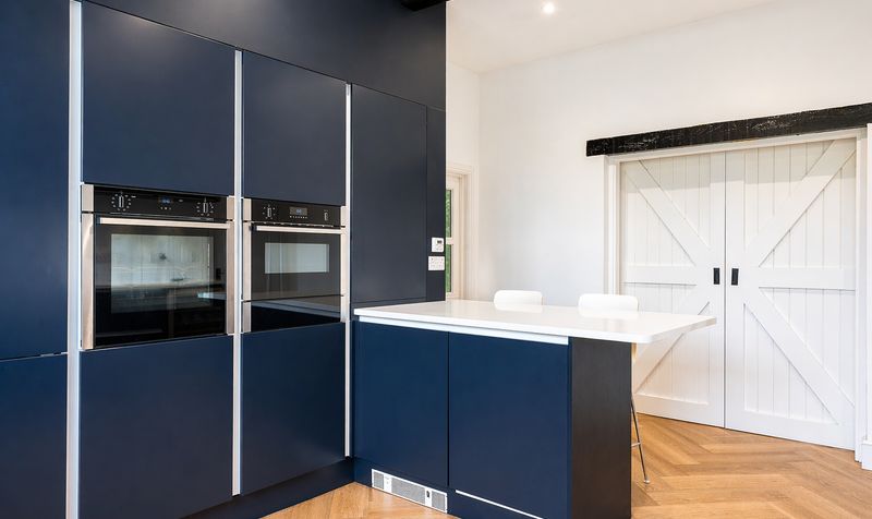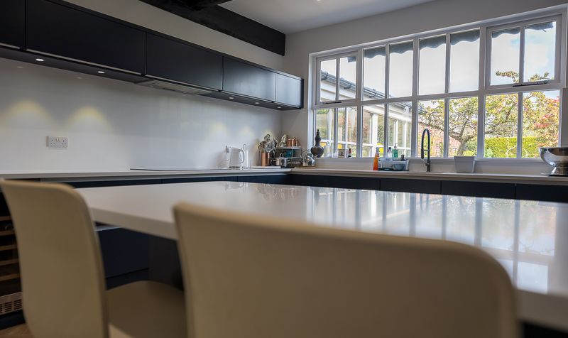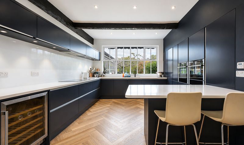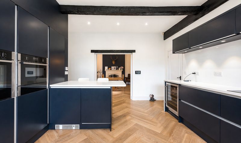 The kitchen is a sleek and contemporary space, thoughtfully designed with a striking contrast of deep navy cabinetry and crisp white worktops. Arranged in a practical U-shape, it offers an abundance of storage alongside high-end integrated appliances, including twin ovens and a wine cooler. A central breakfast island provides additional workspace and a relaxed seating area, ideal for casual dining or entertaining. Exposed beams add further character, while a large window floods the room with natural light and frames pleasant garden views, creating a bright and stylish yet highly functional heart of the home.