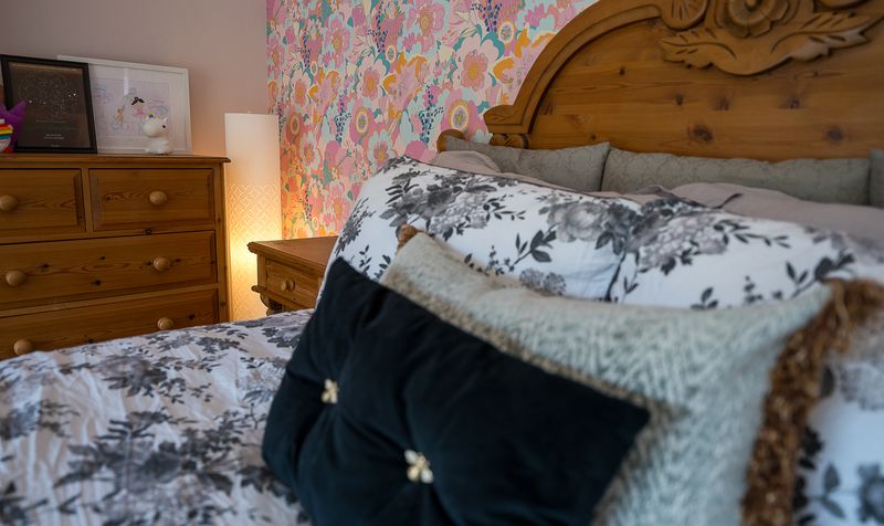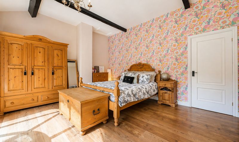 Bedroom two is a spacious and beautifully presented double room, featuring exposed beams and a striking arched window that fills the space with natural light. The room is enhanced by a stylish feature wall, adding a sense of personality and charm, while still offering ample space for furnishings. Bright and welcoming, it provides a comfortable and versatile environment, ideal for family members or guests.