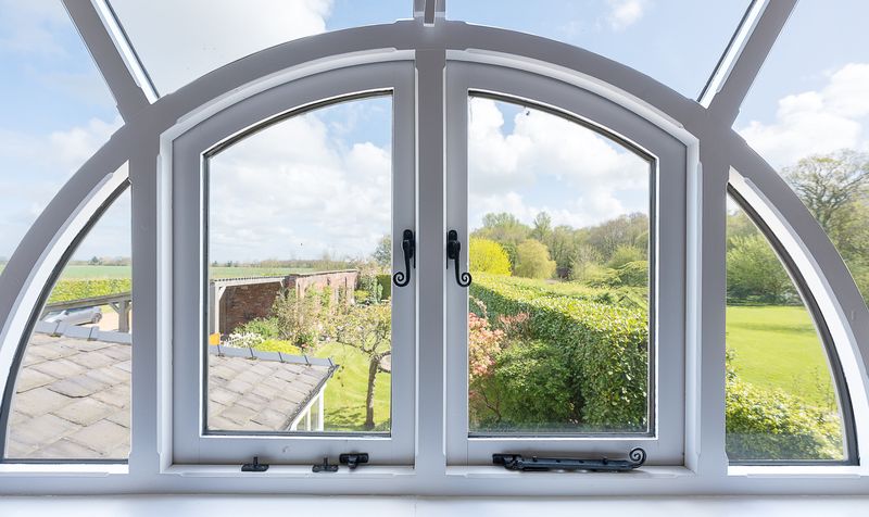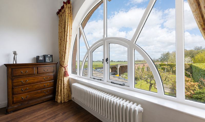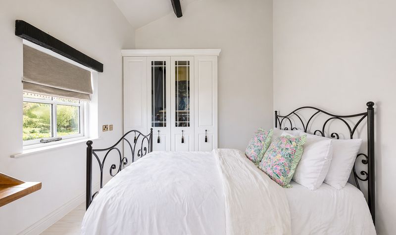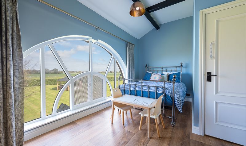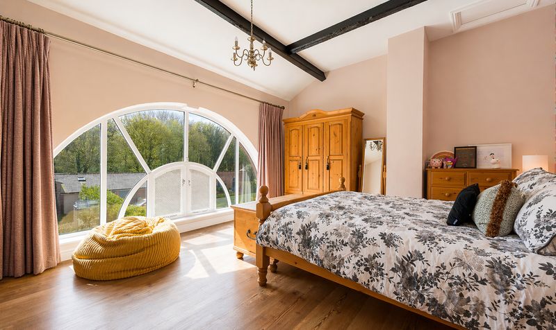 Bedroom three is a charming and well-proportioned room, beautifully enhanced by a striking arched feature window that floods the space with natural light and offers delightful open views. With exposed beams adding character and a vaulted ceiling creating an added sense of height, the room feels both bright and airy. Tastefully presented and versatile in its layout, it is perfectly suited as a comfortable bedroom for a child, guest room, or even a stylish nursery.
