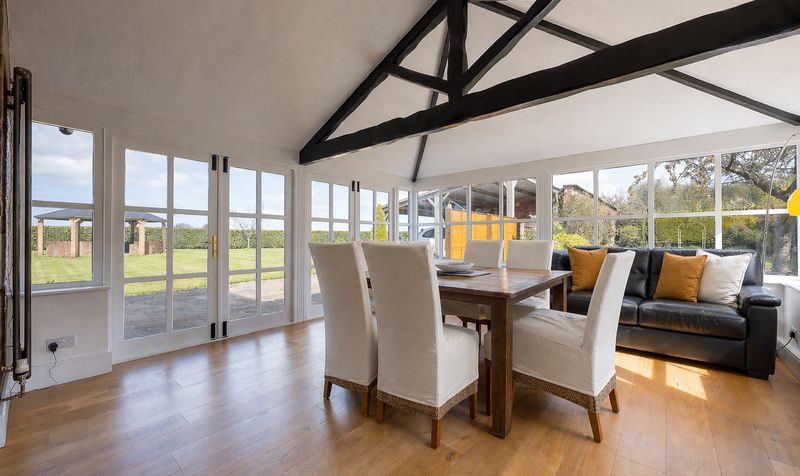 The orangery is a true highlight of the home, bathed in natural light from surrounding windows and enhanced by exposed timber beams overhead. Currently utilised as a dining and entertaining space, it comfortably accommodates a large table and enjoys direct access to the gardens via French doors, creating a seamless indoor-outdoor flow and offering beautiful views across the grounds.