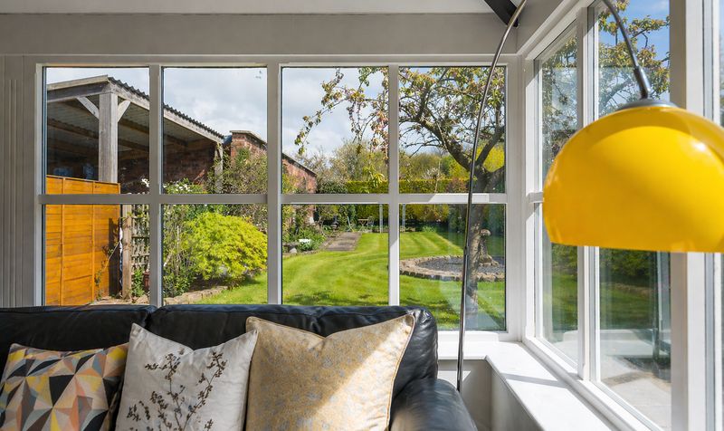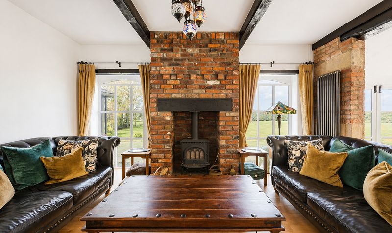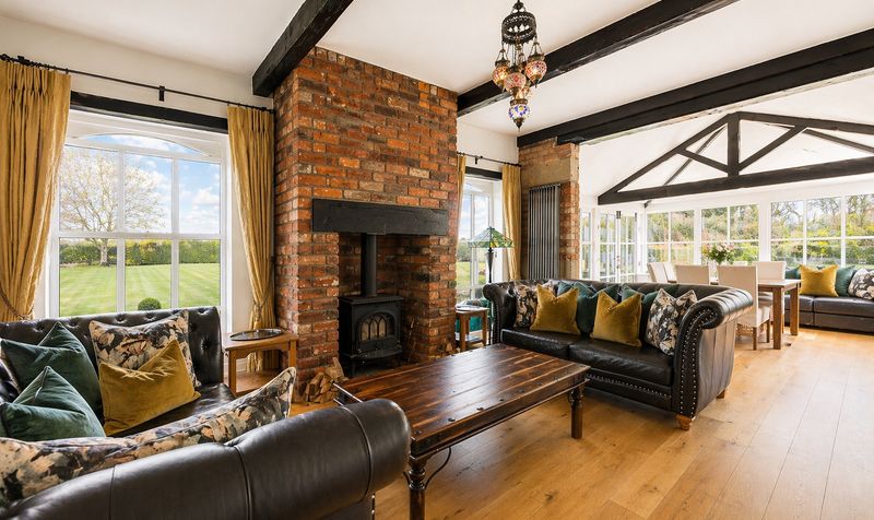 Positioned to the left, the main lounge is a striking and inviting space, rich in character with exposed beams and a central log-burning stove set within a substantial exposed brick chimney breast. Generously proportioned and flooded with natural light from dual-aspect windows, it creates a warm and relaxing atmosphere, effortlessly flowing through to the orangery beyond.