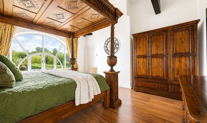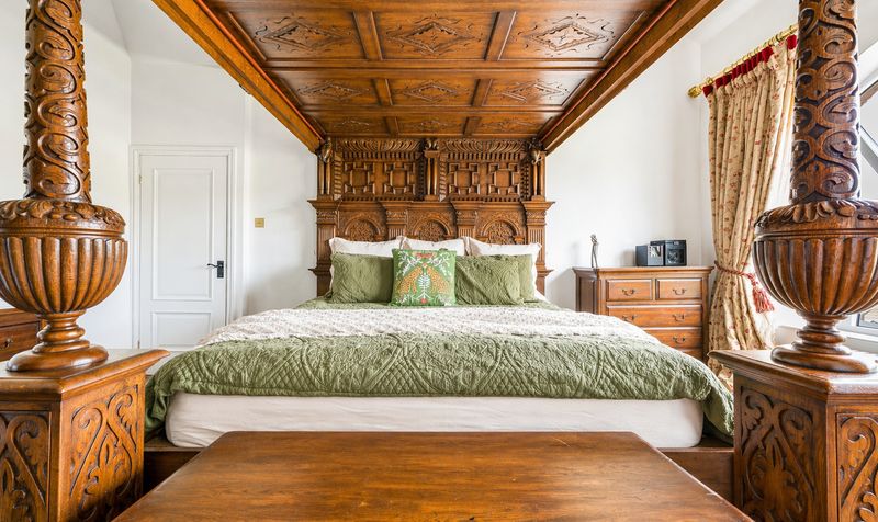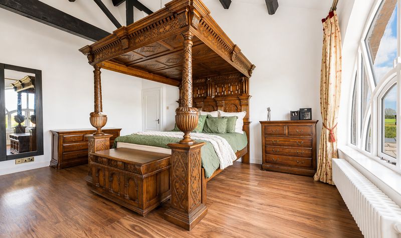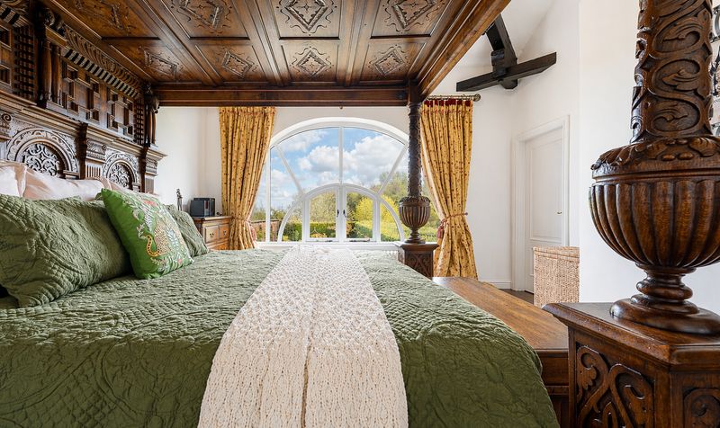 The main bedroom is an exceptional and character-filled retreat, centred around a stunning, intricately carved four-poster bed that brings a true sense of grandeur to the space. Exposed beams and vaulted ceilings enhance the room’s scale and charm, while the striking arched window floods the room with natural light and enjoys far-reaching views across the surrounding countryside. Generous in size, the room comfortably accommodates a range of furnishings, creating a luxurious yet relaxing sanctuary.