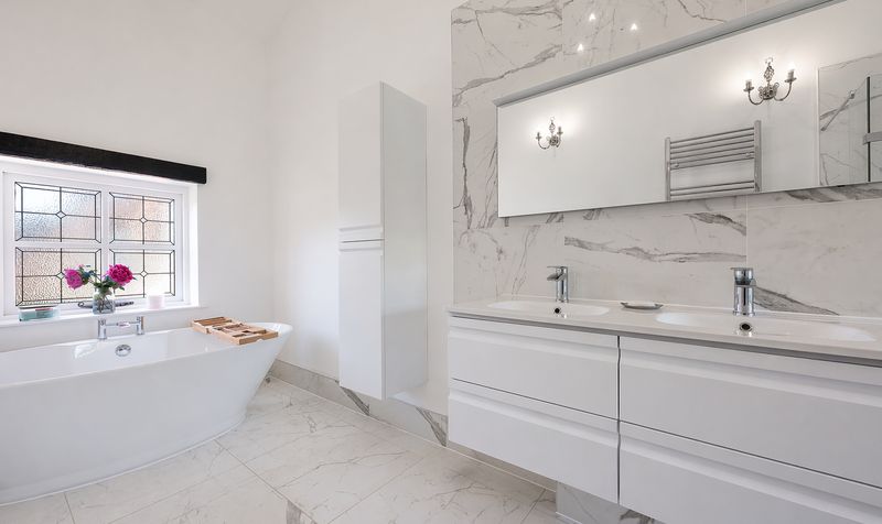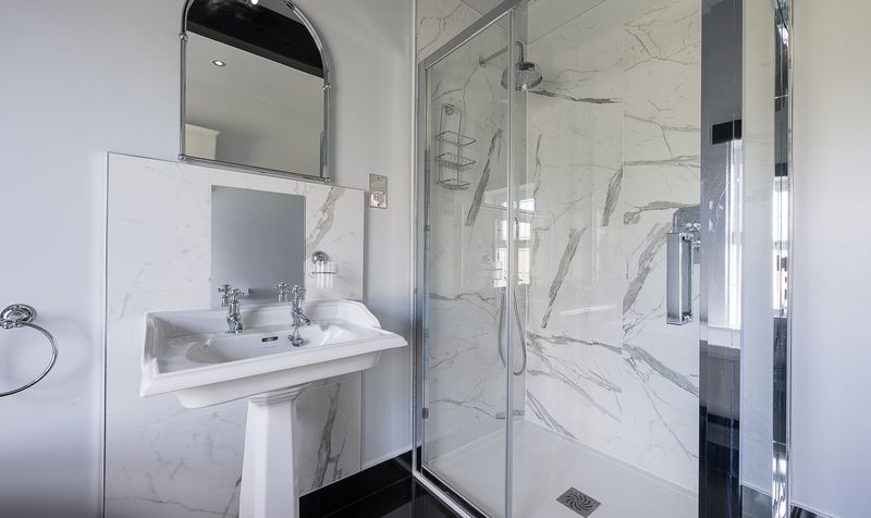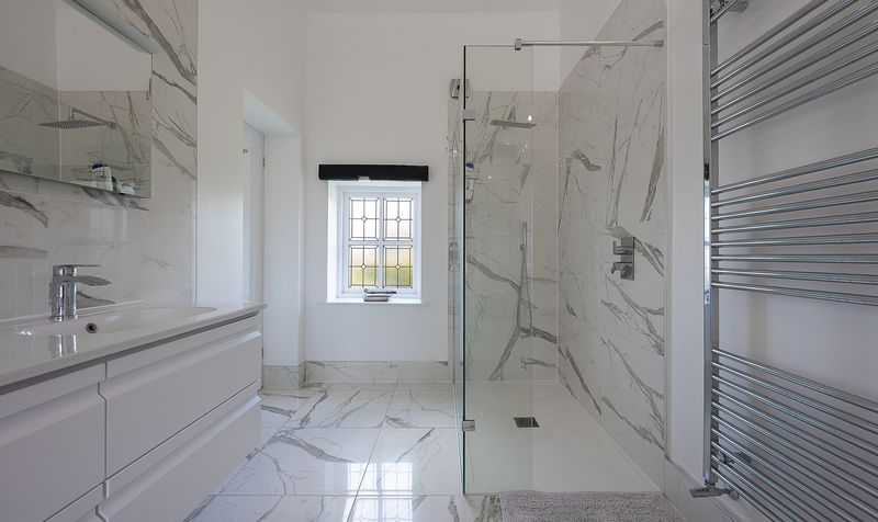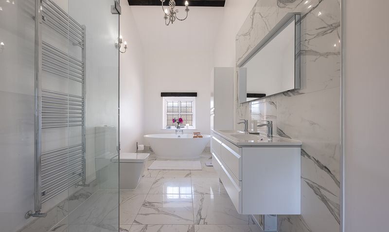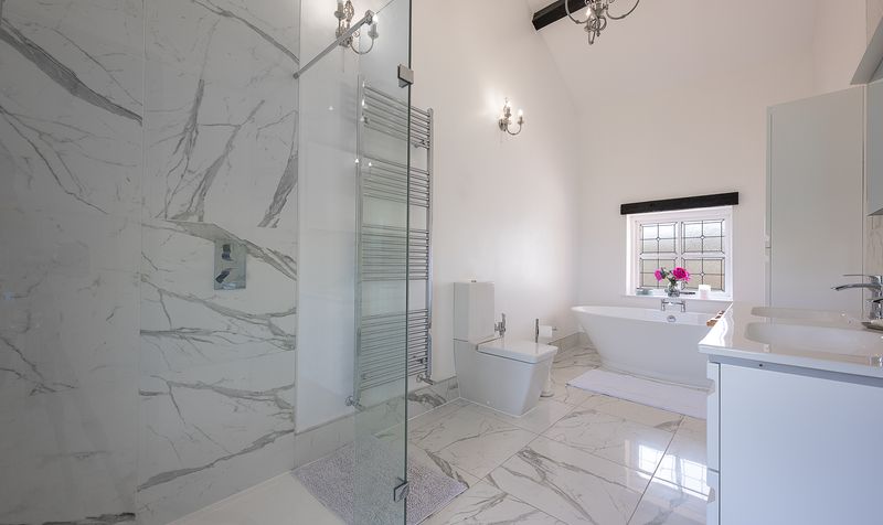 The accompanying en suite is equally impressive, finished to a high standard with elegant marble-effect tiling throughout. It features a sleek walk-in rainfall shower, a contemporary double vanity unit, and a freestanding bath positioned beneath the window, offering a peaceful spot to unwind. With its high ceilings, quality fittings, and abundance of natural light, this private suite delivers both style and comfort in equal measure.