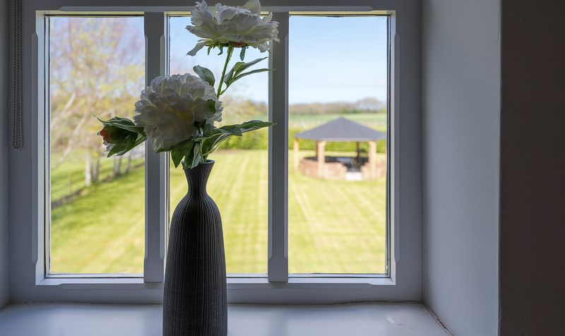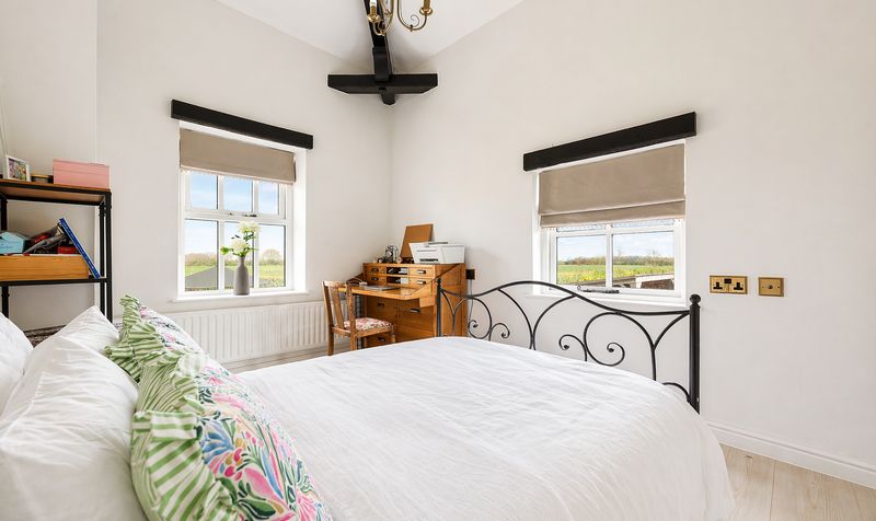Bedroom four is a well-presented and cosy double room, enjoying a bright dual-aspect outlook from two windows that frame pleasant countryside views and allow for an abundance of natural light. The vaulted ceiling, complemented by exposed beams, enhances the sense of space and character, while the neutral décor creates a calm and inviting atmosphere. The room is both practical and versatile, with space for freestanding furniture, making it ideal for guests or family members.