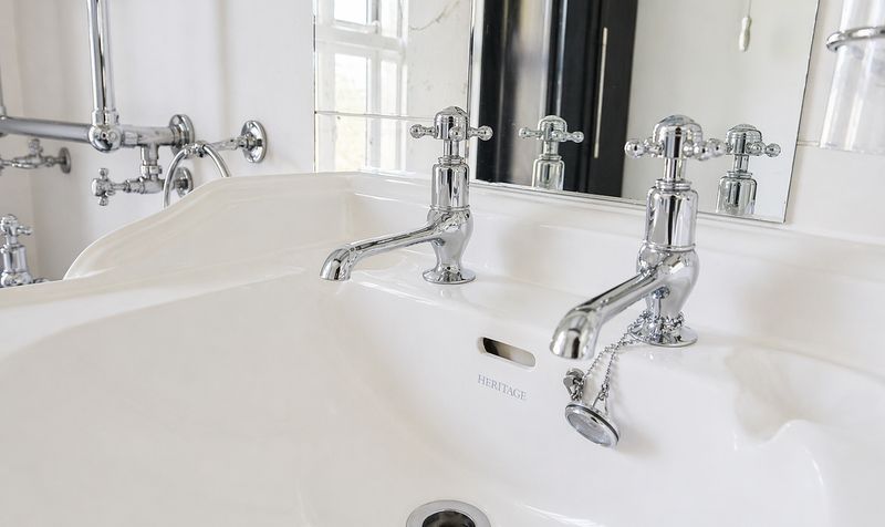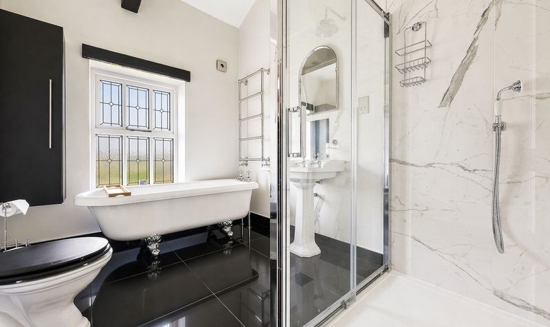 The family bathroom is beautifully appointed, combining classic elegance with modern finishes. A freestanding roll-top bath with traditional chrome fittings creates a striking focal point beneath the window, while a separate walk-in shower with sleek glass enclosure and contemporary tiling offers everyday convenience. The space is finished with stylish black floor tiles that contrast perfectly with the crisp white sanitaryware, including a pedestal wash basin and WC. Chrome heated towel rails and high-quality fixtures throughout complete this luxurious and thoughtfully designed bathroom.