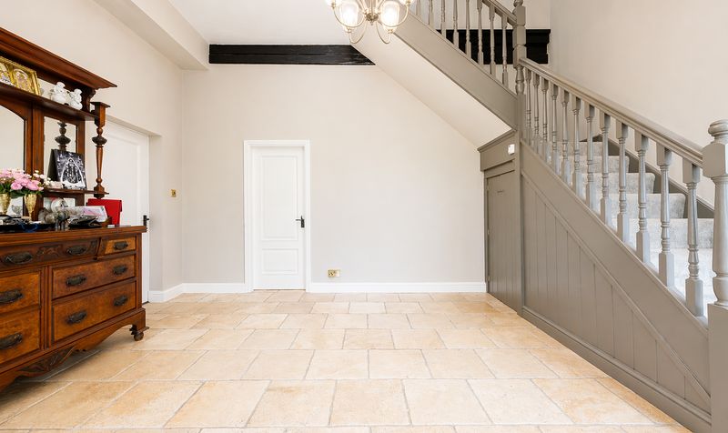Upon entering, a grand and welcoming entrance hall creates an immediate impression, featuring exposed beams, tiled flooring and a striking staircase rising to the first floor. This impressive space offers both practicality and elegance, with doors leading to the main living areas.